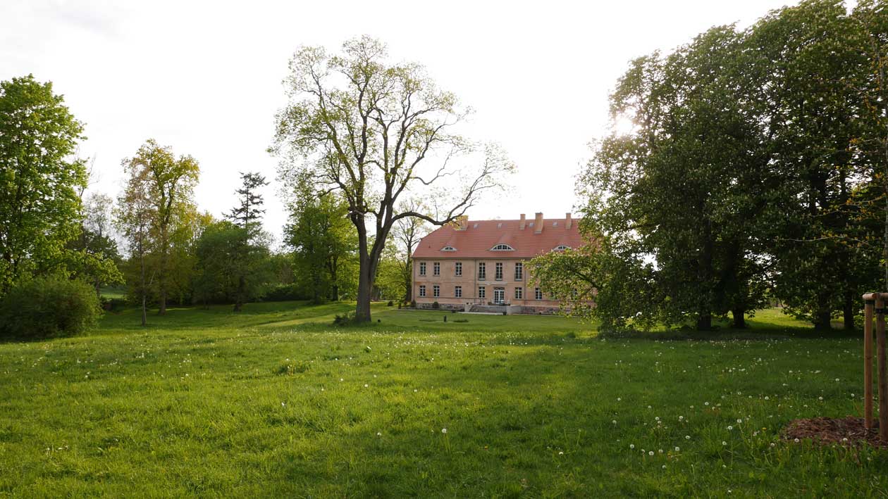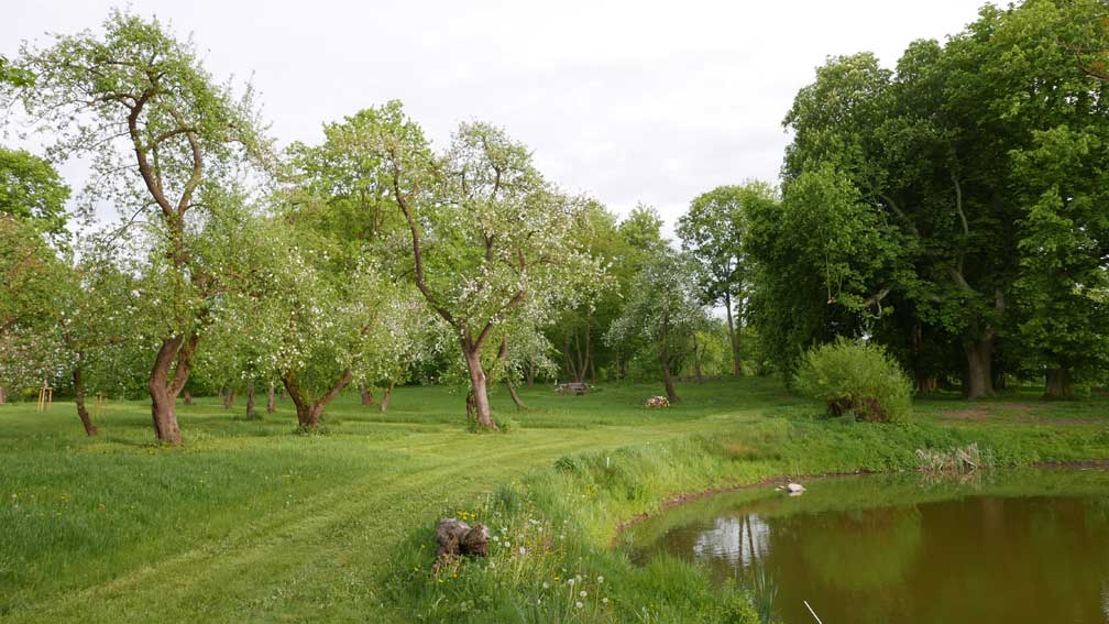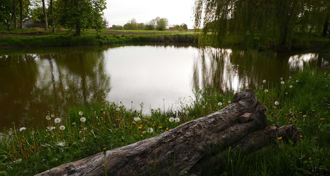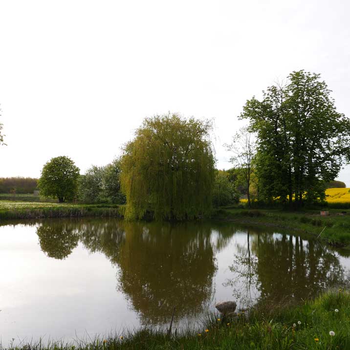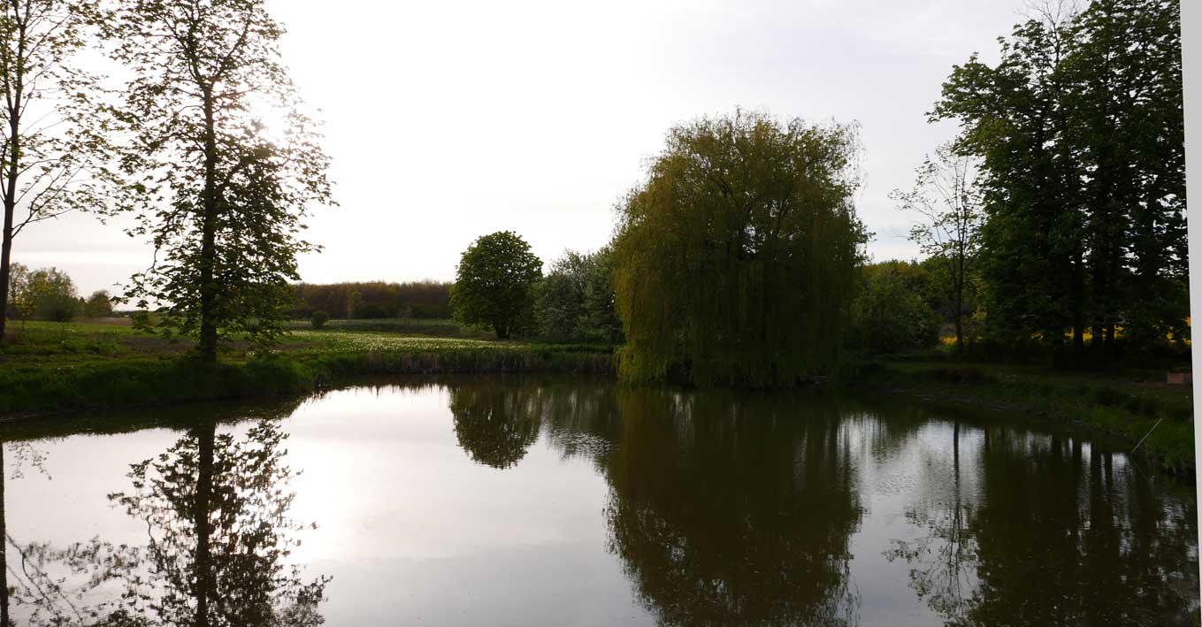 der Platz der Hausherrin dahinten geht über den Teich hin ins Land