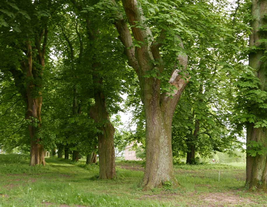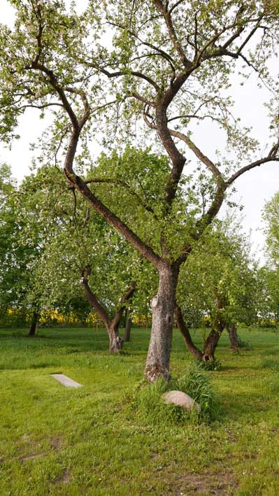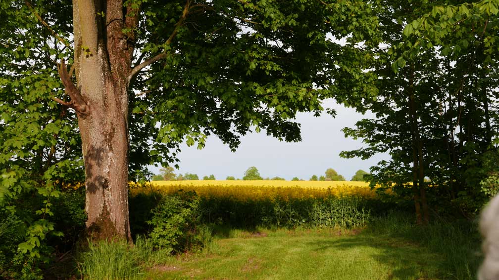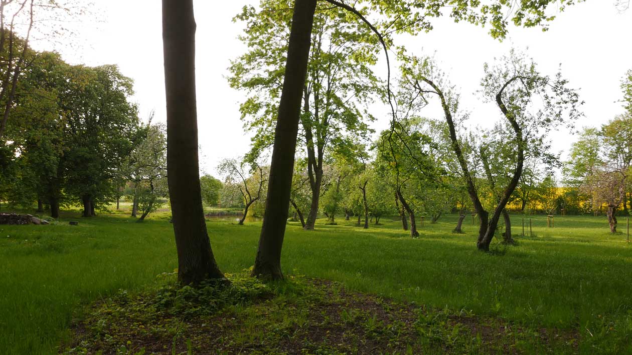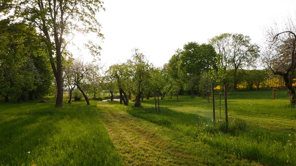 und erkennen das Nebeneinander von Laub- und Obstbäumen mit den Feldern dahinter