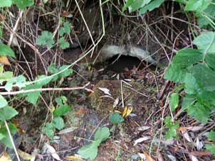 Der Graben, der angeblich das Regenwasser des gesamten Dorfs ableitet und dies ins Rohr führt, war am Tag darauf ohne Wasser, auch nach 5 Stunden Absperrung, um das Rohr für das Fräsen von neuem Wasser freizuhalten. staute sich nichts. Das entspricht dem Zustand des Grabens vor dem Rohr, indem er hinten wie vorne sorglos sich selbst überlassen verkrautet. Diese Situation der Verkrautung haben wir auch nach dem Rohrende in dem Graben danach wieder nach dem Fräsen dokumentiert.