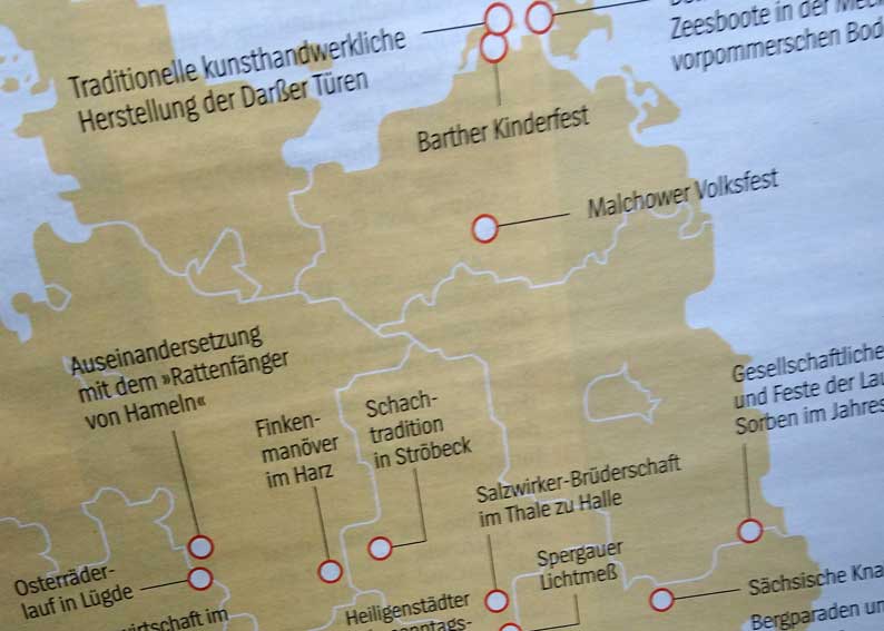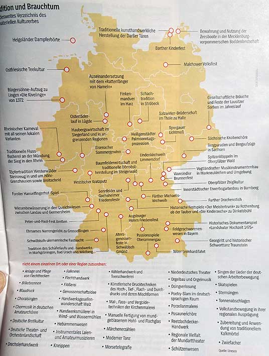 eine Karte des Landes zu den immateriellen Werte -unescowürdig- zeigt Mecklenburg Vorpommern als leeren Raum. Das muss nicht am Mangel der Vorkommen liegen. Eher ist zu vermuten, dass diese Region es bisher nicht vermochte sich darzustellen.