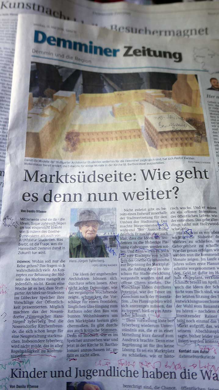 Ein Leserbrief war gschickt worden. Aus Freundlichkeit an die lokale Demminer Redaktion. Mit 2 Fragen. An den, der von der letzten Sitzung des Ausschusses für Stadtentwicklung Umwelt und Umwelt festgeschrieben hatte. Aber nichts vom Auftritt des Vorsitzenden T. in Sachen Markt der Stadt. Als ob das nicht erwähnens wert sei.