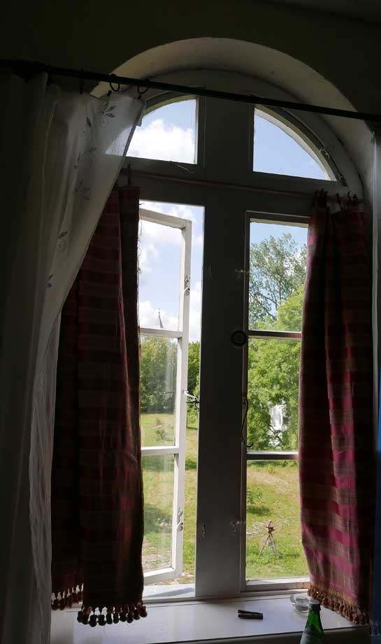 Das rundbogige Fenster im Giebel auf der Hofseite im neuen Versuch mit rosaseidenem Innen- und Unterfutter