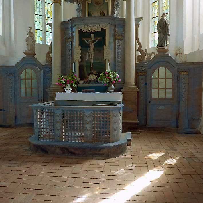 und hier an den Fussleisten des Altars die blaue Oberkante mit blauen Brettern dann an der Barriere jetzt grau überstrichen.