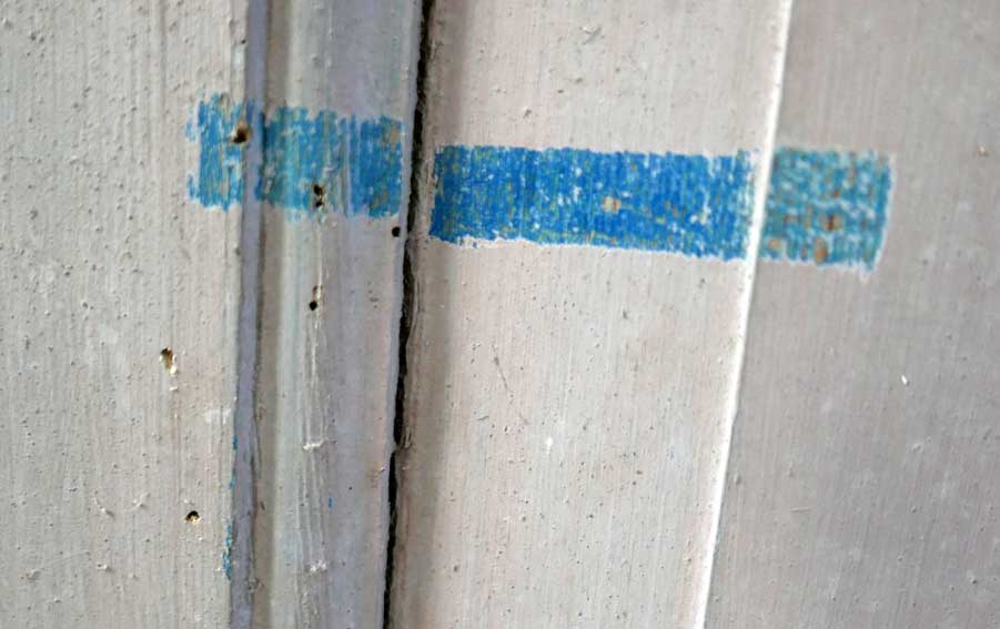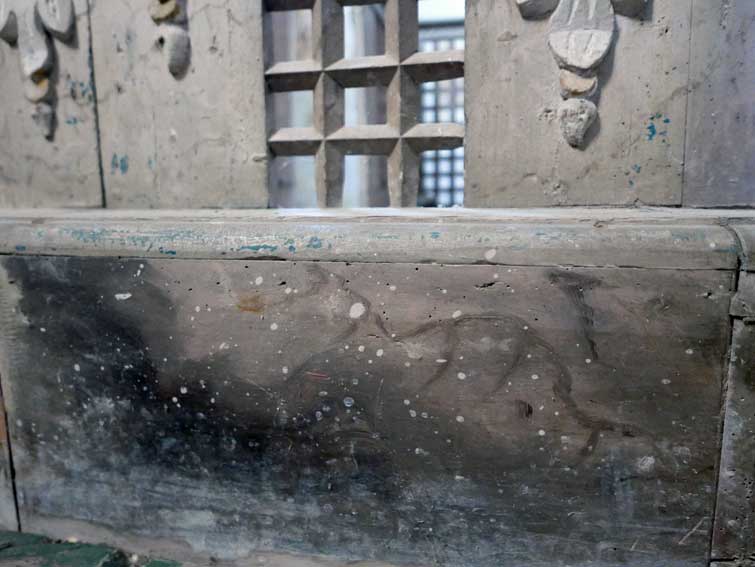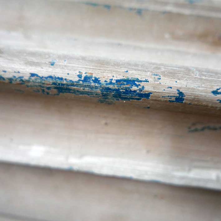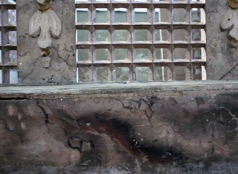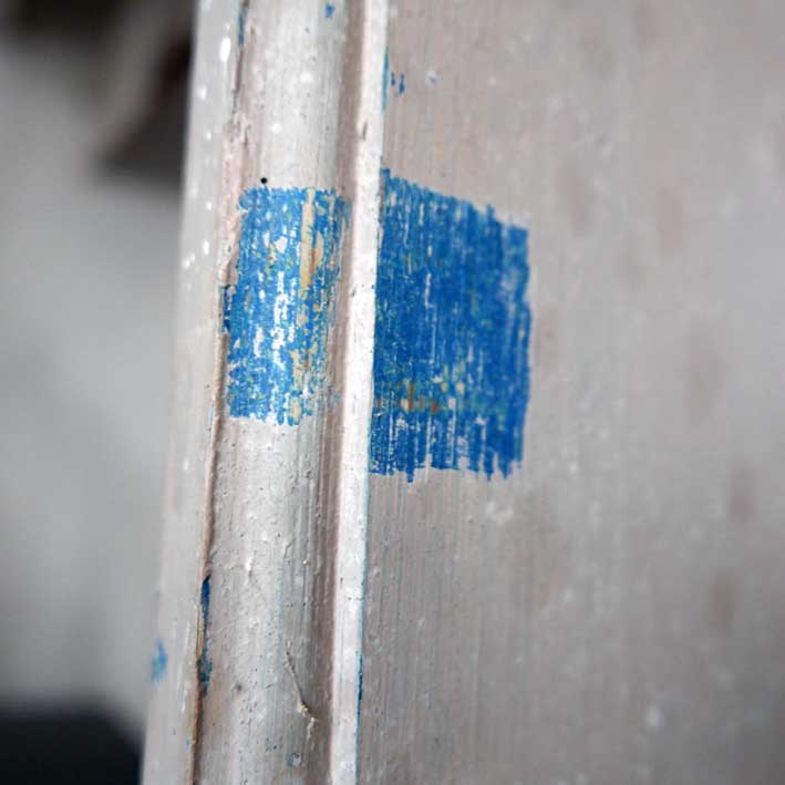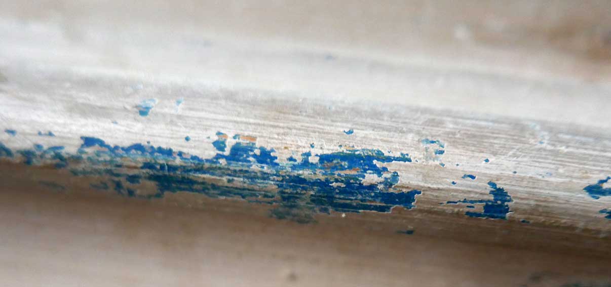 weitere Proben vom überstrichenen Holz unter der Orgelempore, die damals im 19.Jh. entstand. Das Blau wie am Altar. Wieder freizulegen. Unter der Orgel jetzt waren damals 2 in sich geschlossene kleine Partronats-Kabinette. Logen für spezielle Teilnehmer der Gottesdienste.