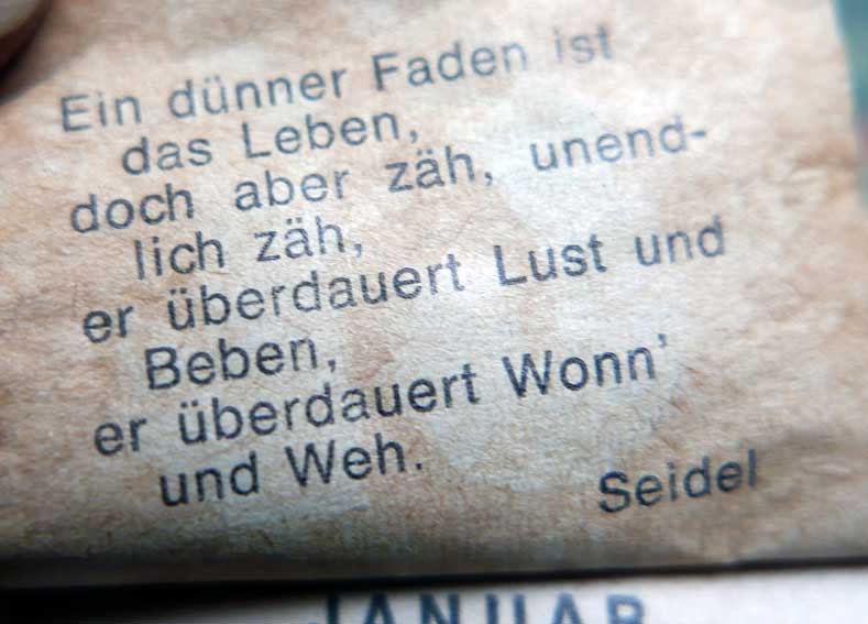 der Kalender stehen geblieben am Tag des Todes. Von der Mutter, wieder zusammen dann, so überlassen. Mit Rückseite. Sie überlebte ihn ein Jahr.
