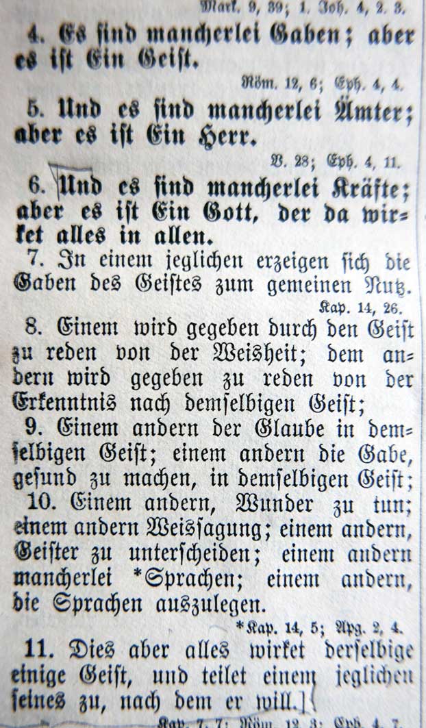 Und es sind verschiedene Kräfte; aber es ist ein Gott, der da wirkt alles in allem.