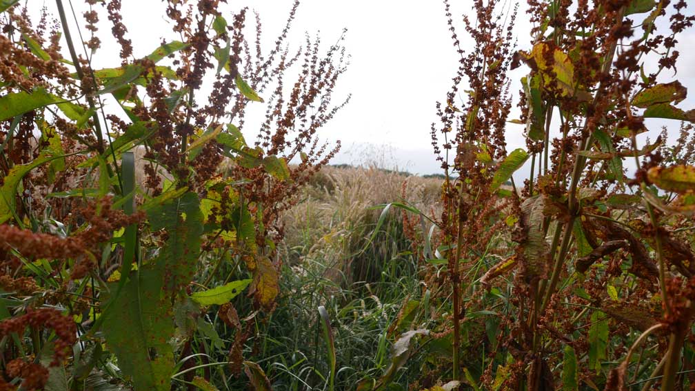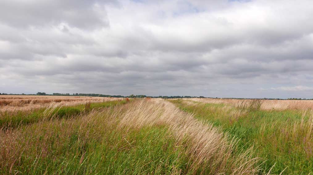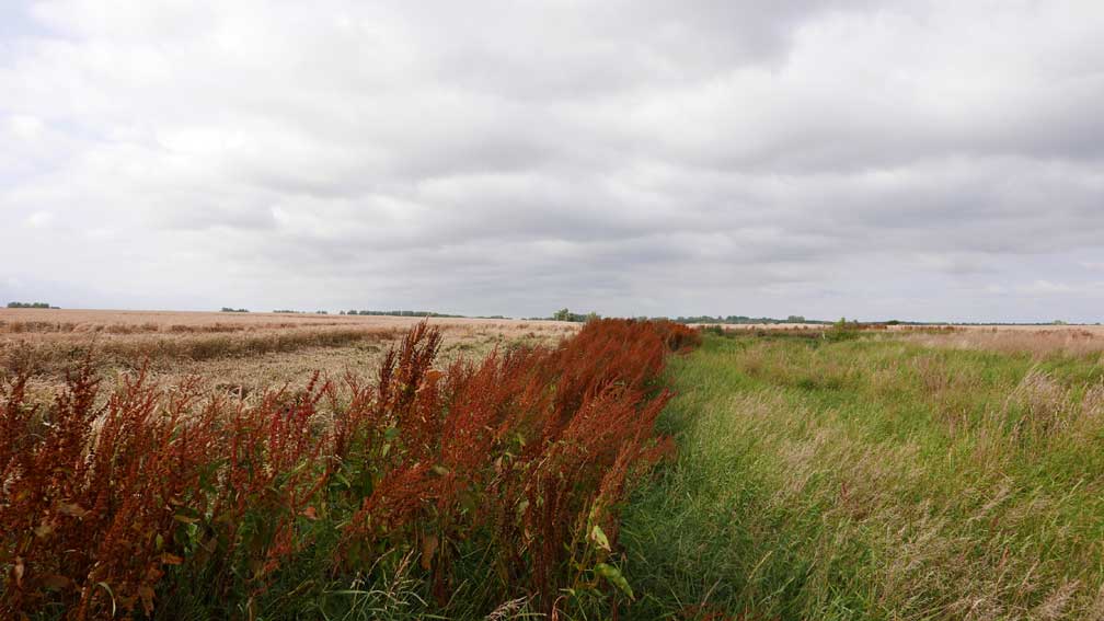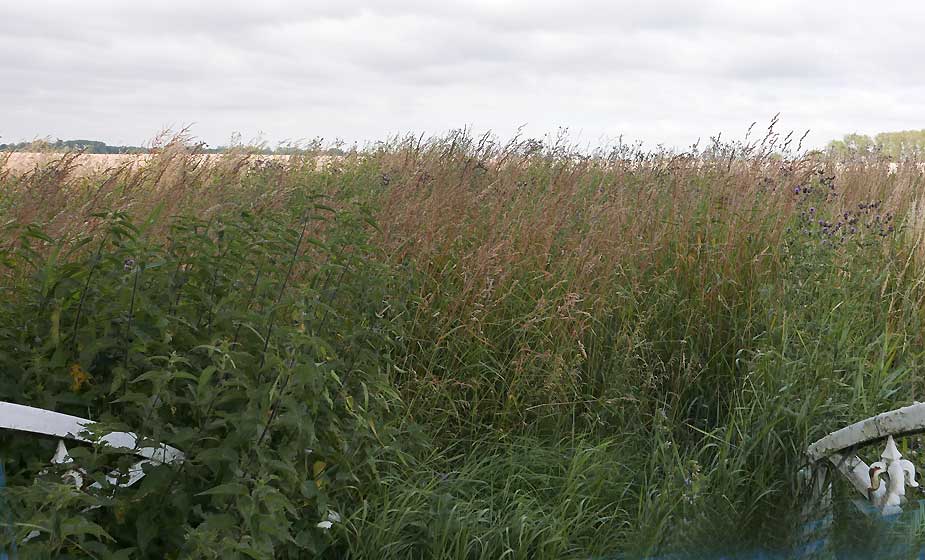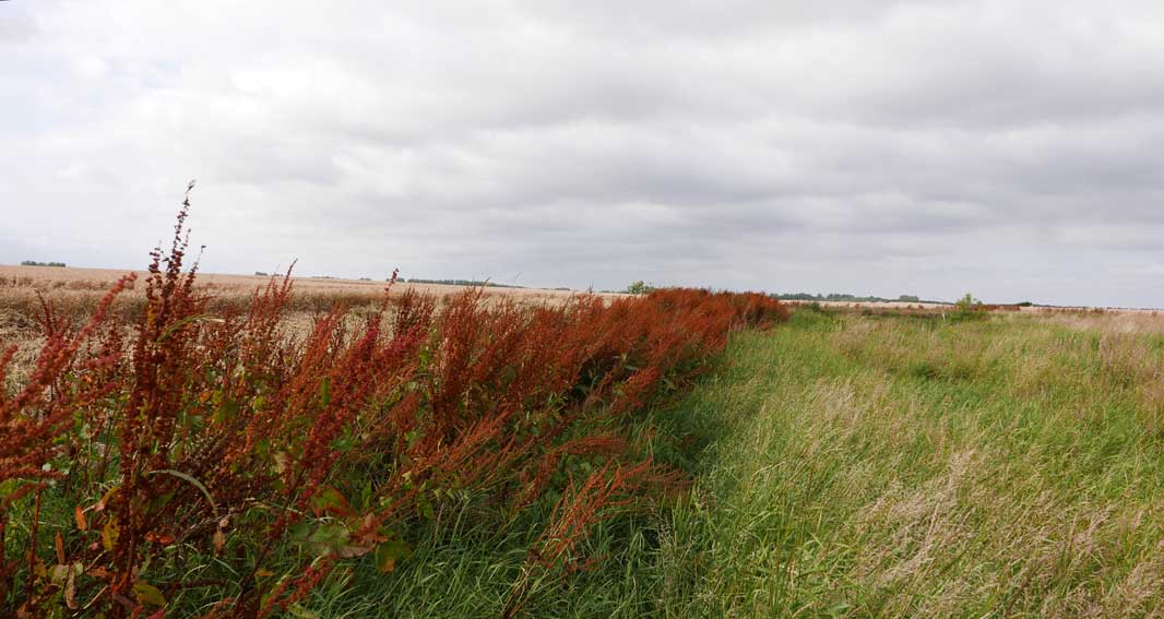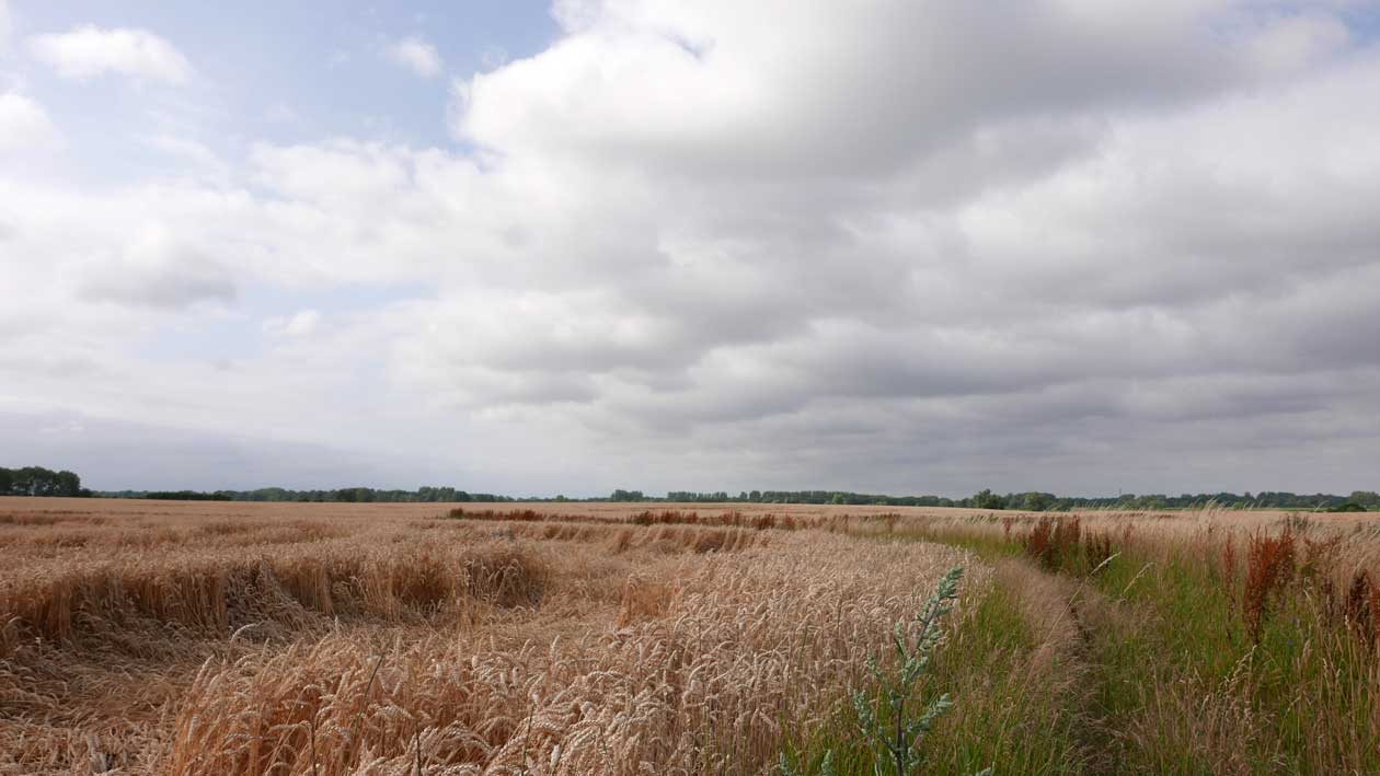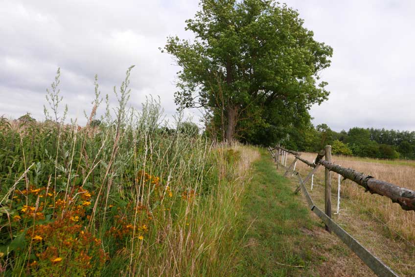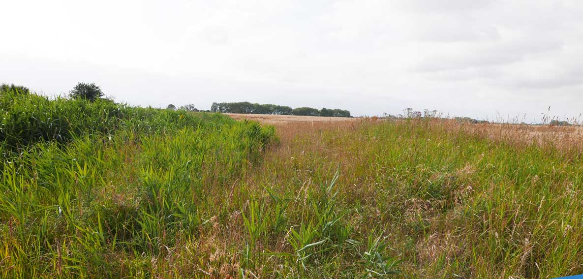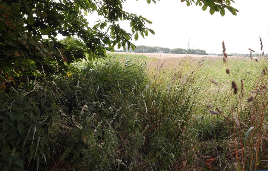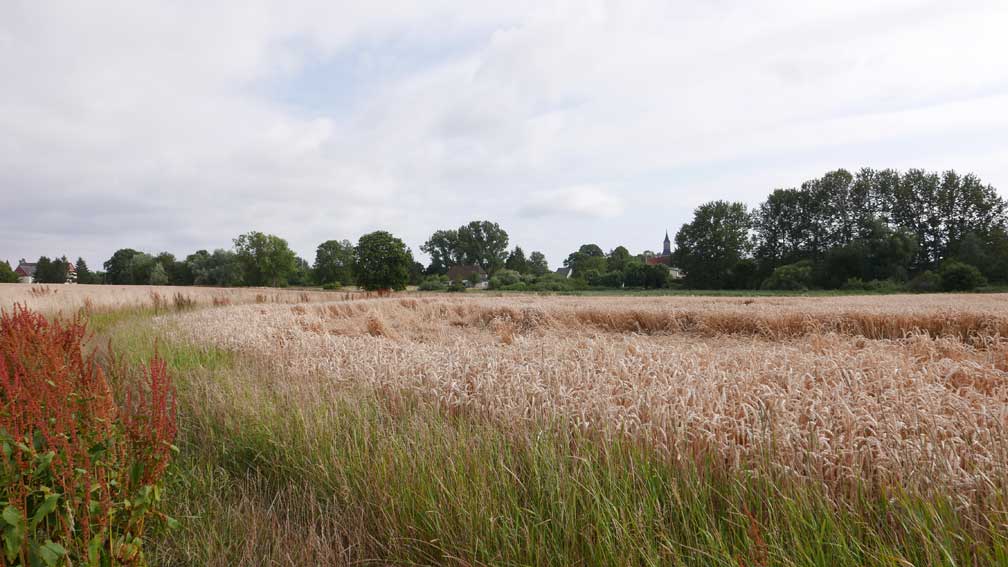 Links das goldene Kornfeld, in der Mitte der verkrautete Weg als Randgebiet zum ehem. Graben grün