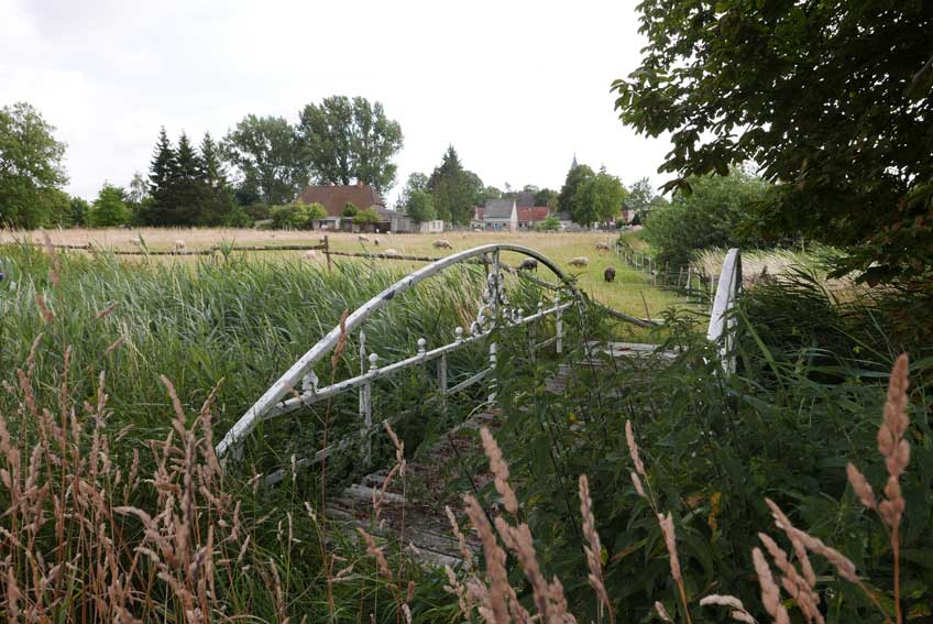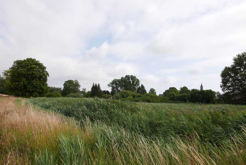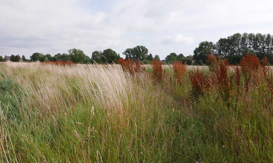 entlang dem Graben, wie er aus dem Rohr kam, früher, als wir wieder kamen, jetzt grünes Feuchtgebiet, vertrocknend