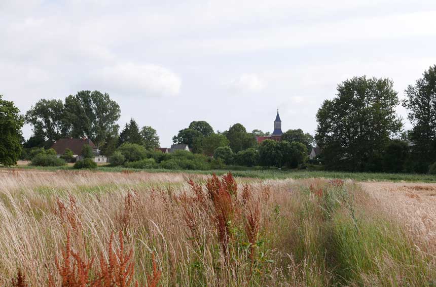 was vom Feldweg übrig ist mit Blick zum Wald verwildert und zurück zum Turm