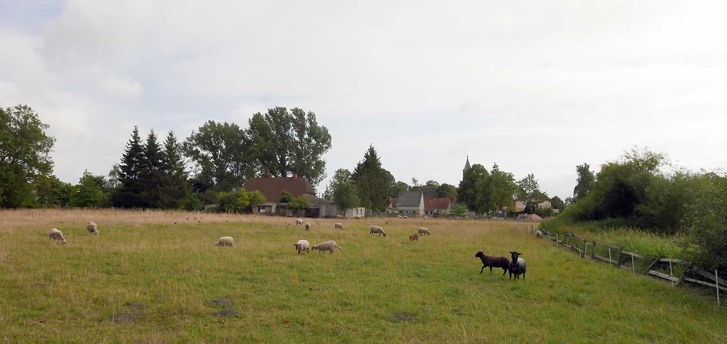 der Turm, Wiesen mit Schafen, Häuser, Zäune Leben, der Weg.