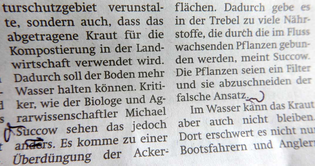 Wenn Succow recht hat, ist das Entkrauten der Geässer also hier der Trebel nicht nur falsch, sondern, kriminell. Denn er ist der Wissenschaftler und hochdekoriert(altern. Nobelpreis). Dafür wächst auf den Feldern ohne Wege, dh. ohne Insekten und Bienen insbesondere, die Wüste täglich, die uns umbringt.