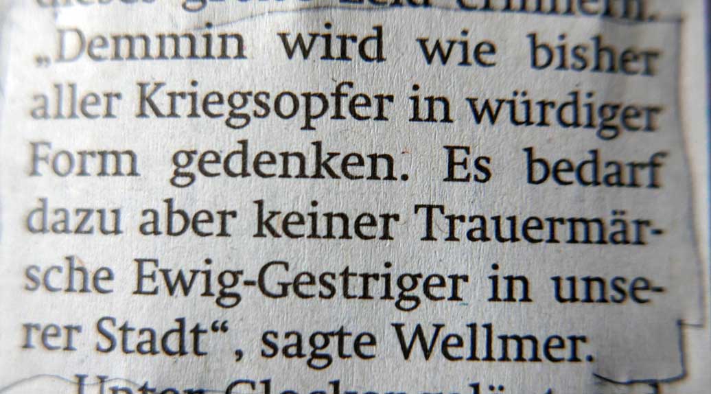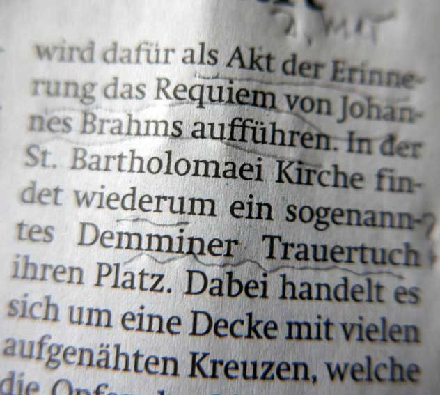 Dass nun wieder ein Requiem(nach Mozart nun Bahms)im nächsten Mai -und am Anfang des Monats, als die Demminer Frauen und Kinder starben- nun von Demminer Bürgern gesungen wird, kann mehr Ruhe in die Leere bringen, dass anderes Herumirren wie auch immer bohrend langsam nicht mehr nötig ist.