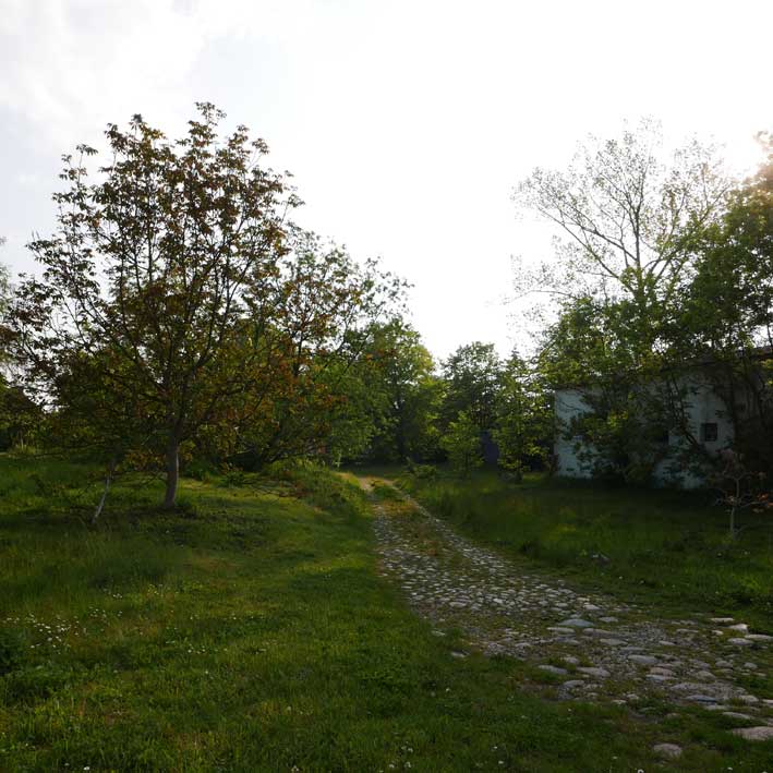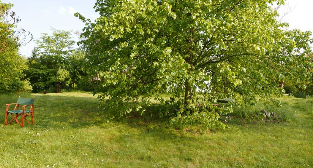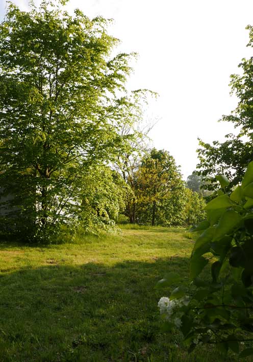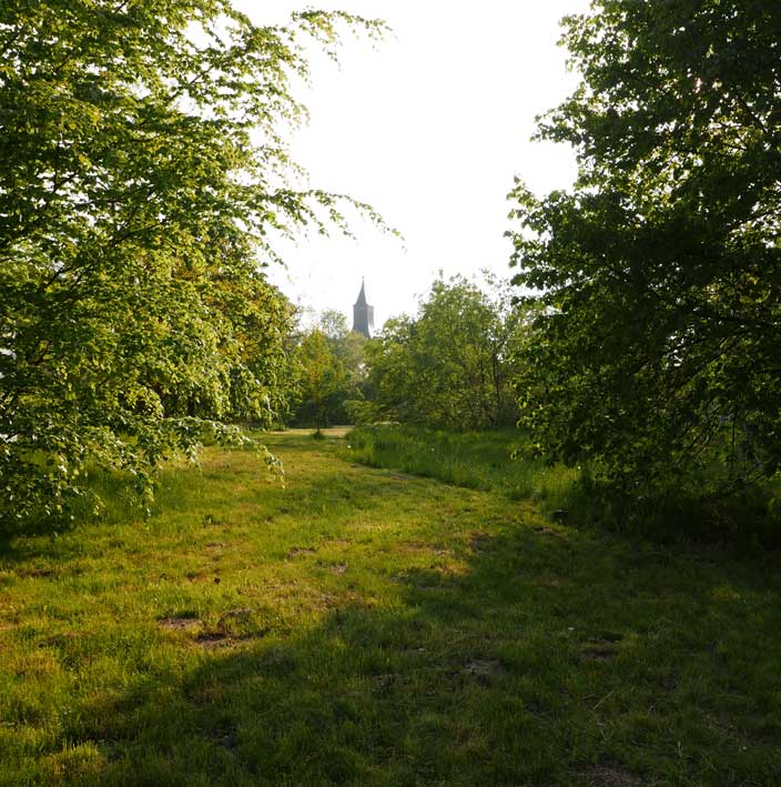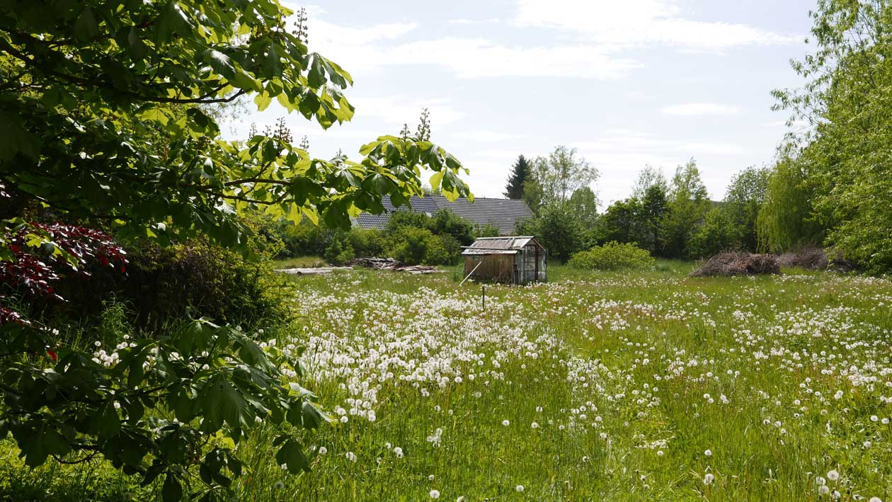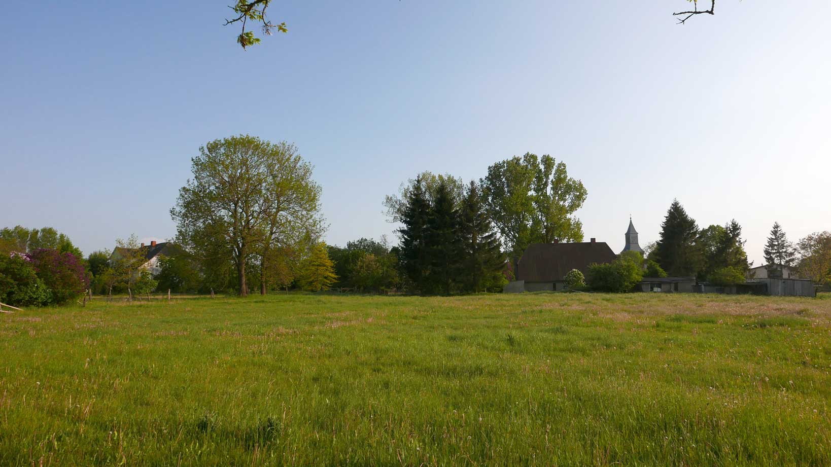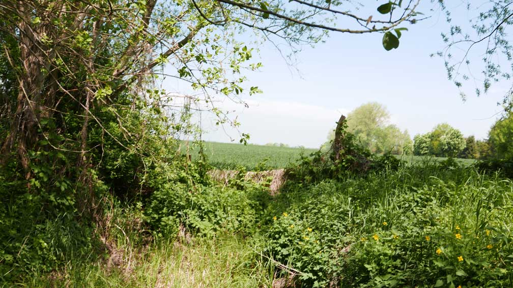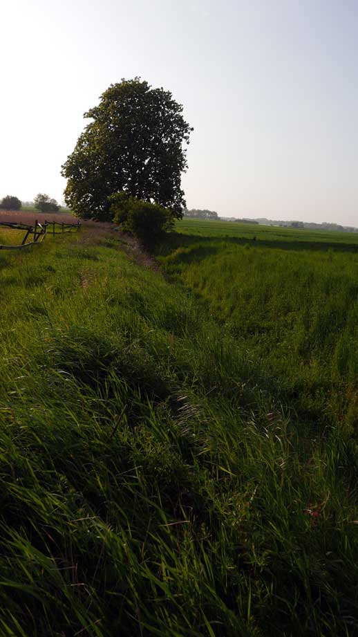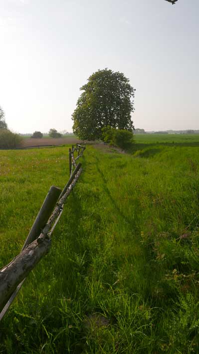 Man gaubt es kaum. Alles so entstanden. Was man sieht. Die Felder da hinten, die Kastanie mit verdeckter Brücke über den Graben, entleert nun aber des Rohres Sinn. Und wir gehen da als sei es das Unsere.