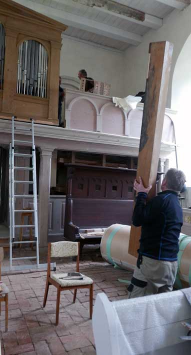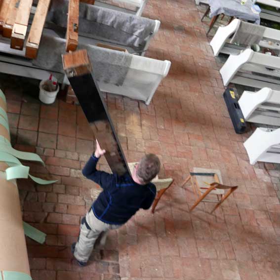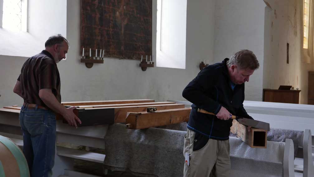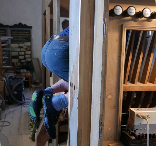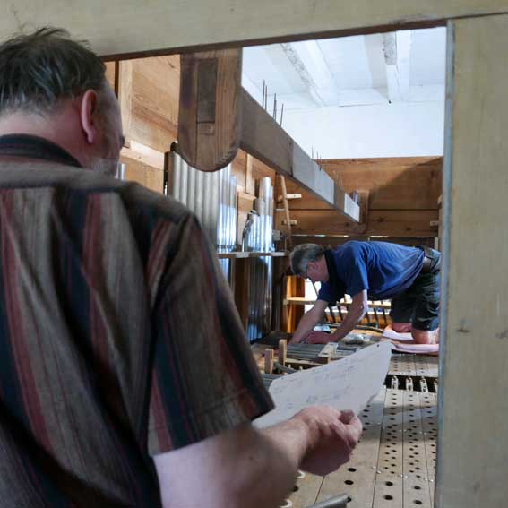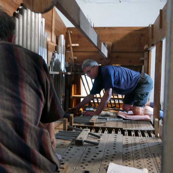 verkürzen, damit der Ton sich anpasst. Bei den grossen in Holz anfangen, den tiefen Tönen.
