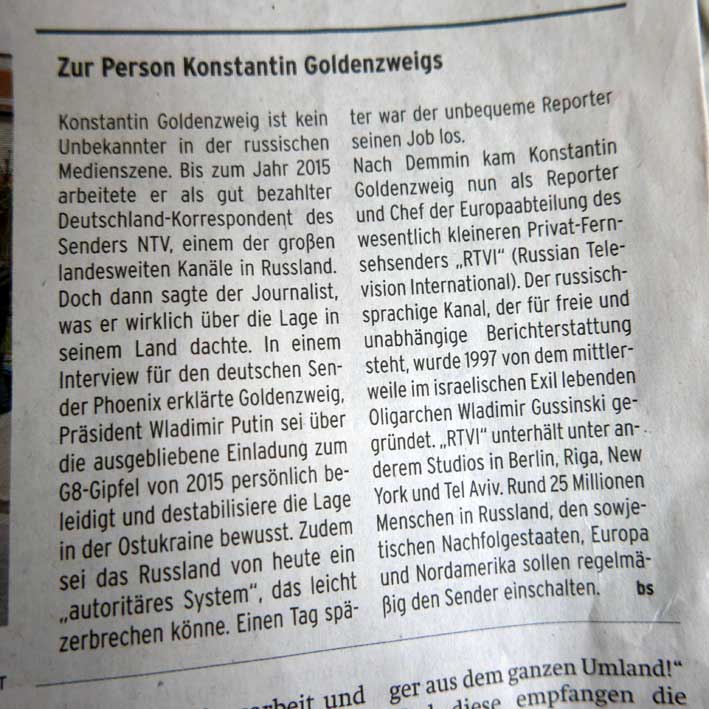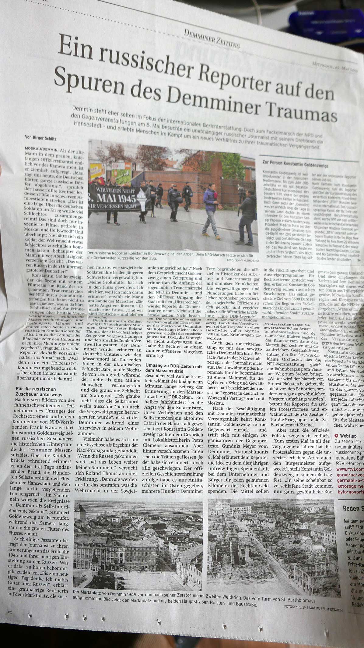 das macht das Putin-TV besser(Wenn sie über 1945 in Ostpreussen und Solschenizyn einen Film zum Thema Kriegsende machen) für Demmin(NK) mags hier genügen. Das alles. Wir werden den Solsch.-Film zeigen in D. Und seinen Text. Aber nicht in Hängematten zu hören, mit Hollywoodschaukeln und als Luftballons