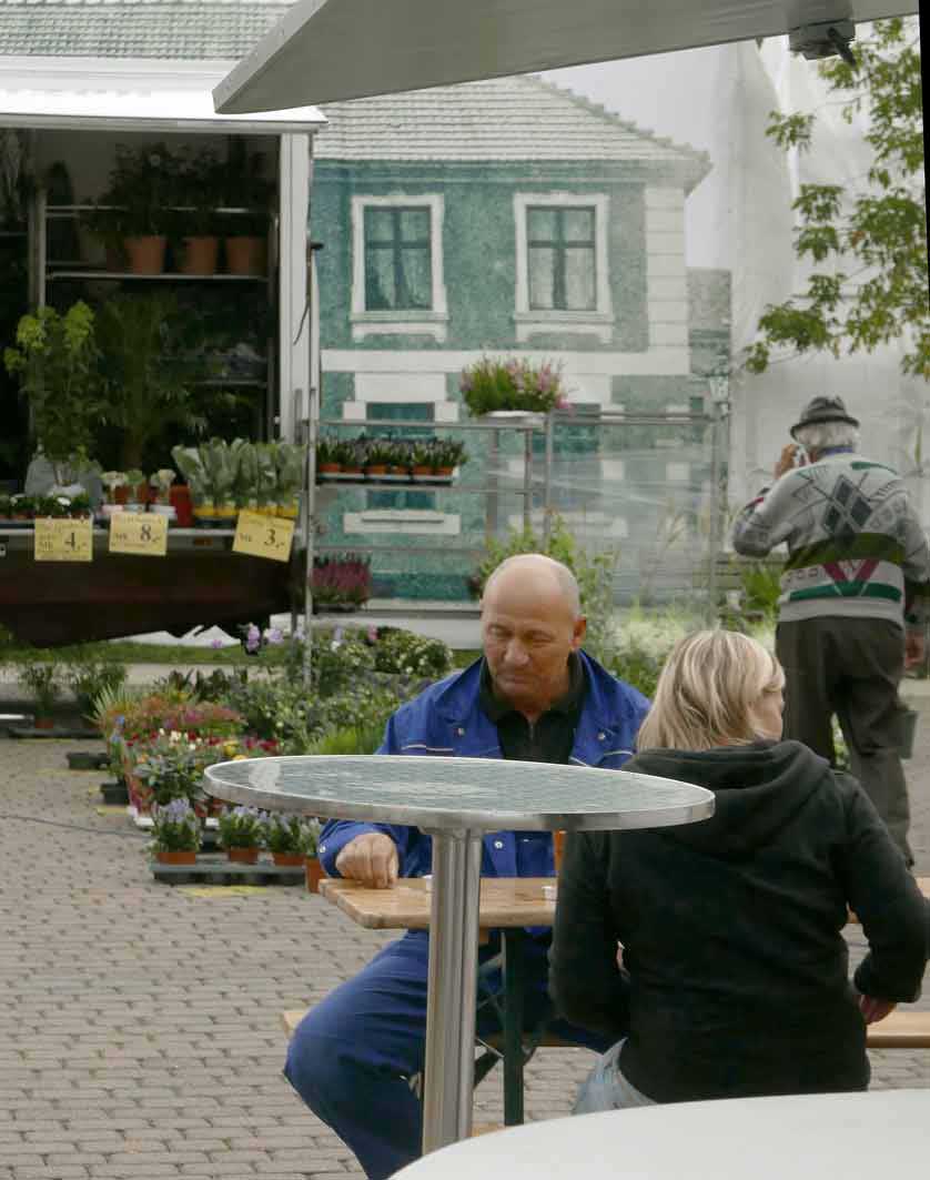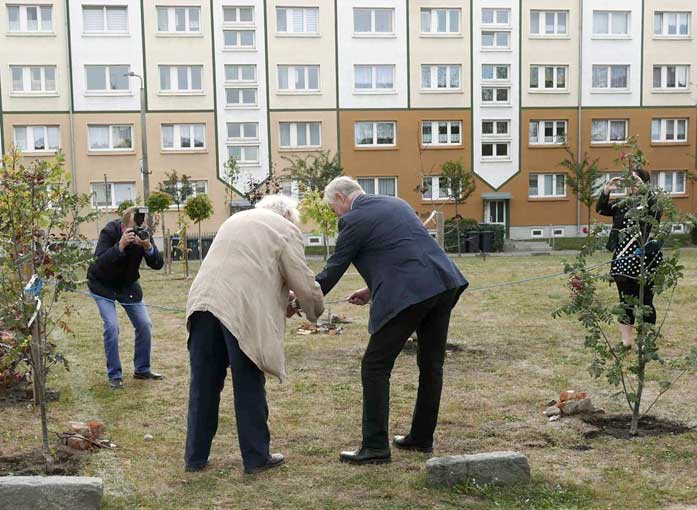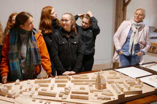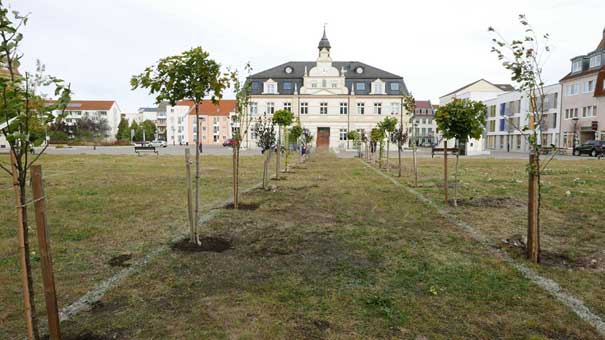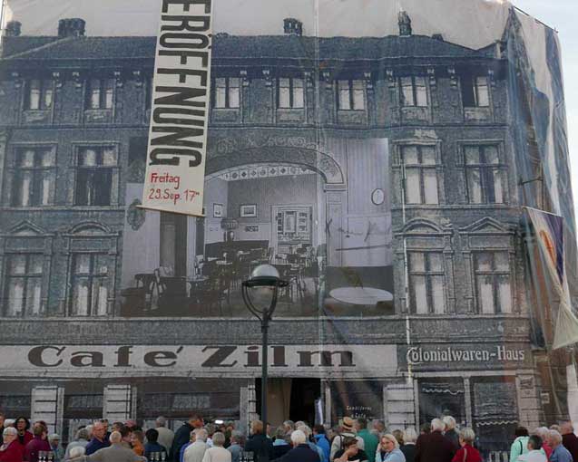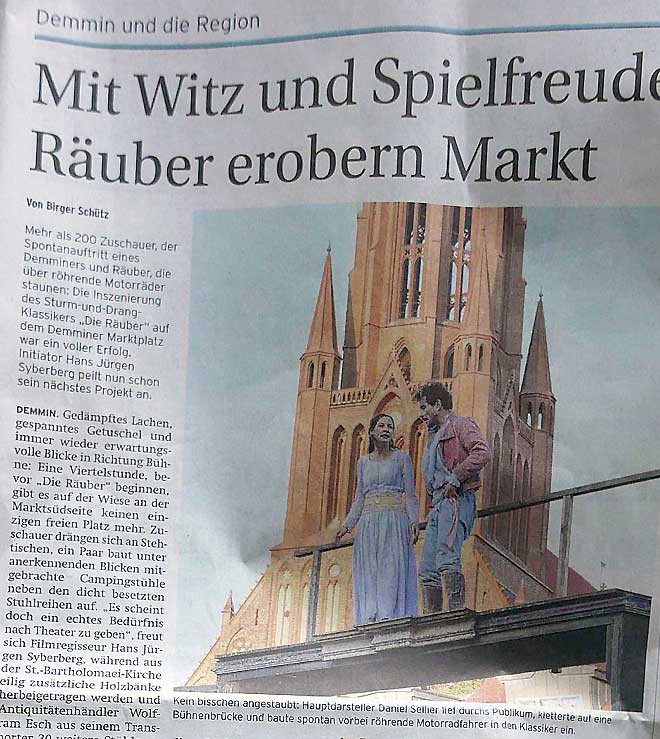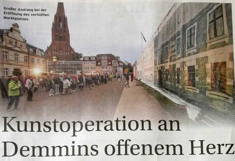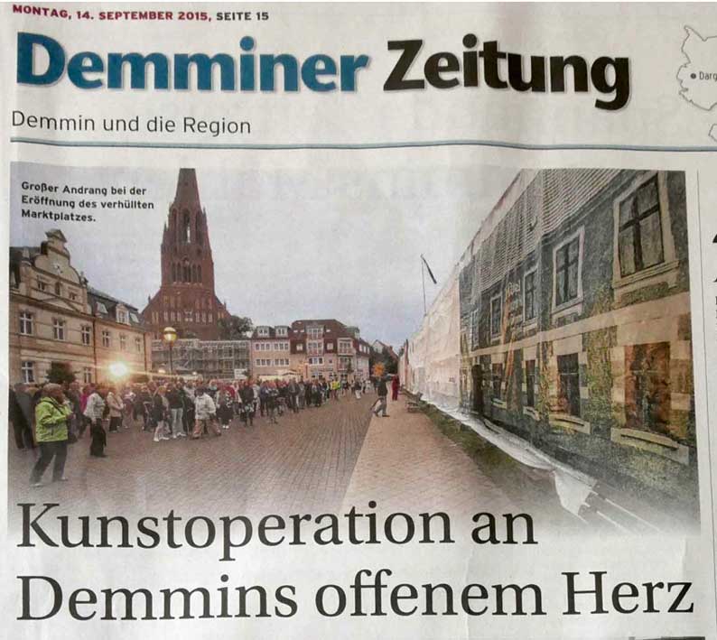 Seit 4 Jahren versuchen wir vom Verein der Freunde in Nossendorf (Verein für Kirche, Kunst und Natur e.V.) in jährlichen Sommer-Aktionen allen in Demmin zu zeigen was da am Markt war und was es heisst, wenn da wieder etwas wäre, was Markt war und heisst. Einerseits mit der alten Begrenzung der angedeuteten Fassaden und Namen bis 1945 vor dem Brand, oder mit dem alten Kellergang als Struktur der Leere jetzt durch Bäume aus Bürgerspenden, wie überhaupt alles geschah durch Initativen der Bürger und ihrer Gelder aus der Stadt und ihrer Freunde, dann mit der Installation des alten Cafe Zilm in der historischen Fassade und Leben darin , auch ein Gastspiel der Räuber aus Berlin mit dem Aufruf zum Wiederaufbau des Marktes, dazu die Modelle (11) zuletzt wie das aussehen könnte. Dass damit auch die an dem Markt stehende Kirche St. Bartholmaei neu belebt wurde, z. B. mit dem Requiem für die Toten von 45 und das Griechische Restaurant mit Aussentischen wieder im Sommer, gehörte zu dem Plan.