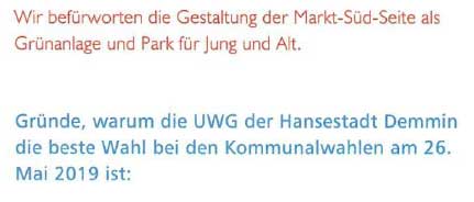 Morgen ist Wahl der kommunalen Verwaltungen. Auch in Demmin. Und da hat die oben stehende Gemeinschaft sich gegen die Wiederherstellung des Marktes in seiner historischen Dimension zur Wahl angeboten. Da diese Wiederherstellung, in alter Quadratur des Marktes, wie überall rundum in Greifswald, Stralsund, Neubrandenburg wieder und Anklam oder Grimmen, zur Zeit produktiv versucht wird, ist es ein Thema, da es um das Zentrum, man könnte auch der Herz der Stadt selbst geht, das nach allgemeiner Übereinkunft seit 1945 nicht mehr richtig schlägt.