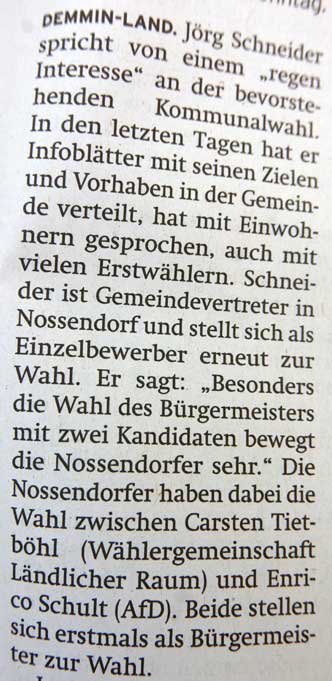 ....warum ist das wichtig. Sie entscheiden, ob Wege hinkommen manchmal mit Geldern der öffentlichen Hand oder oder weggemacht werden, von euch, wer Schnee räumt und für wieviel und wenn wer eingestellt wird für die Gemeinde, wer und wo auch wei es da aussehen soll am Neubau und an der Kita, die vielleicht ein Kinder-Garten werden könnte, vorne und hinten, und wenn er gut ist, wird er fragen. Auch dass wieder Hecken sein sollen,an der Kreisstrasse von N. nach Volksdorf, wird er wollen für die Bienen, wenn er auch an die Bienenfreunde der Gemeinde ist, und nicht nur für seinen Felder, die dann weniger werden und im Schatten liegen. Denn Abstand ist zu halten gesetzlich. Auch das LPG-Rohr wird dann aufgemacht werden müssen vom ehemaligen Stadtgut herkommend auf dessen frühere Felder, mit öffentlichen Geldern und der Ordnung halber. denn die Rohre sind morsch wie die LPG schon längst. Und dem ehem. Stadtgut eine neu Bestimmung geben (zwischen Kläranlage und "Kult-Haus"). All das wird dort auch entschieden und darum müsst ihr wählen gehn, dass es geschieht so oder so. Auch in Medrow den Park sollte die Gemeinde nícht verlottern lassen. Er gehört ihr. Wissen wie und wovon. Zu entscheiden von den Gewählten so oder so oder gar nichts tun?