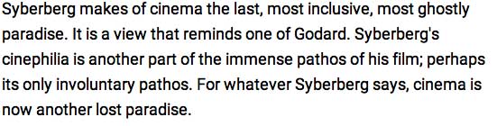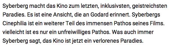 Dies ist eine interessante Auskunft, weil sie vom Kino selbst spricht als Projektions-Raum, wo nun mehr und mehr Filme laufen, die andere sind als die hier wie verlorene, kostbar und eben anders.