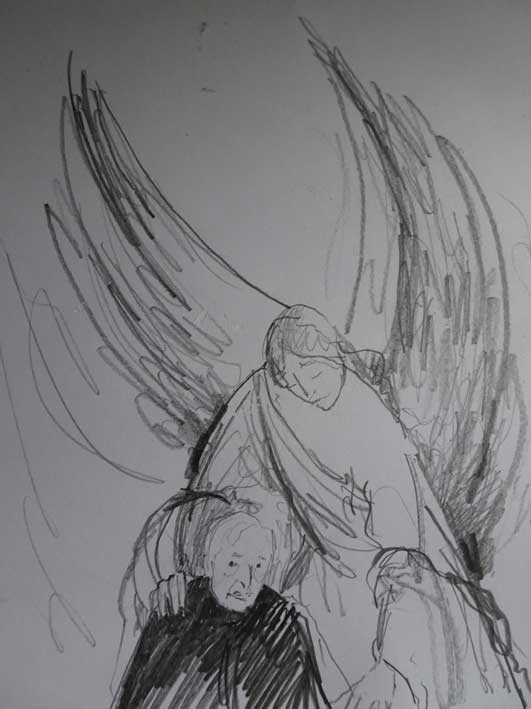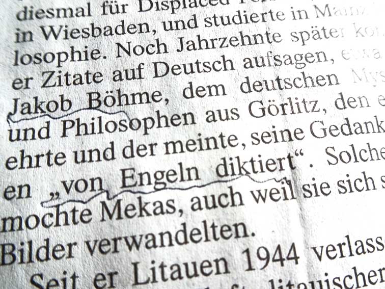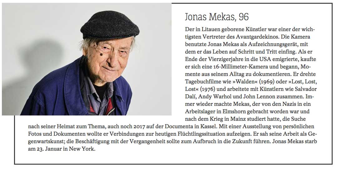 Und Jonas Mekas sprach vom Engel, der ihm diktierte, was zu tun ist, zu sagen, was seit Generationen über Länder und Kontinente zu erfahren war.