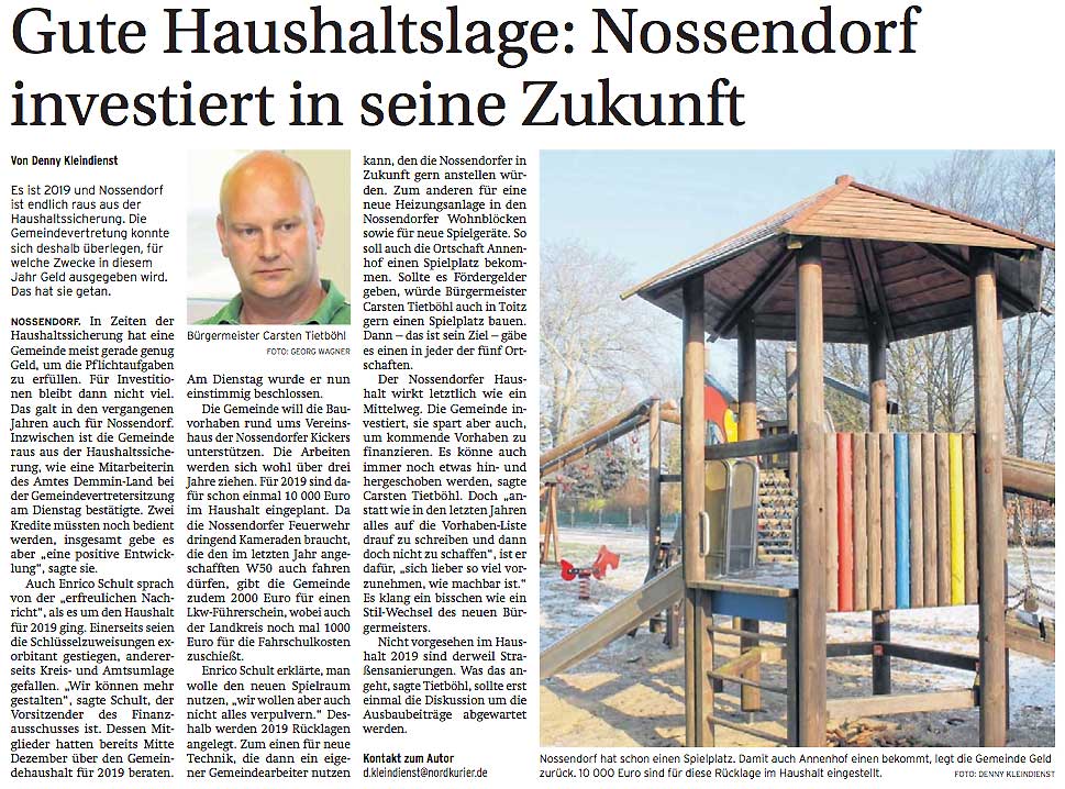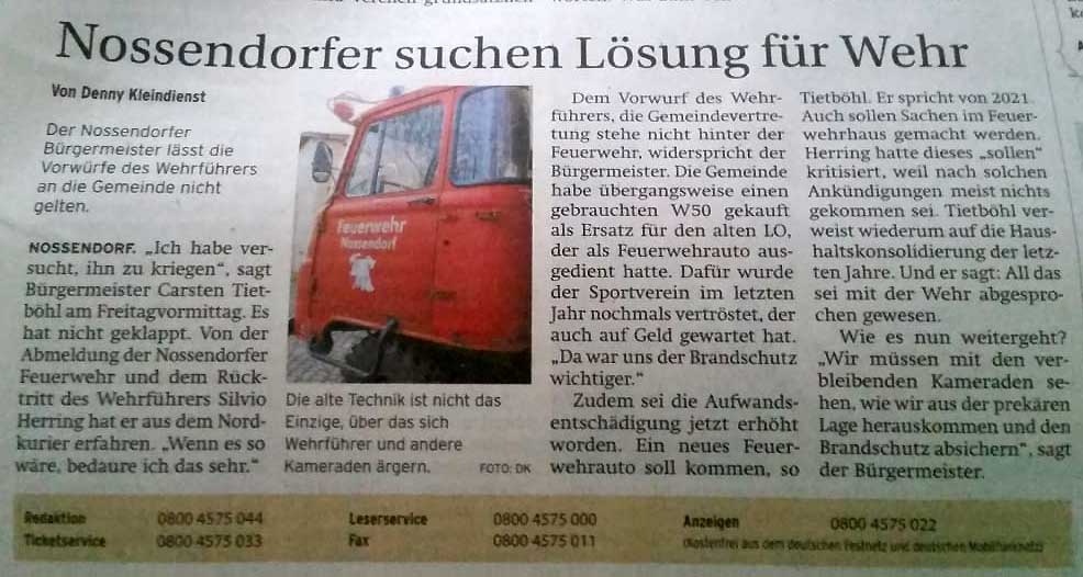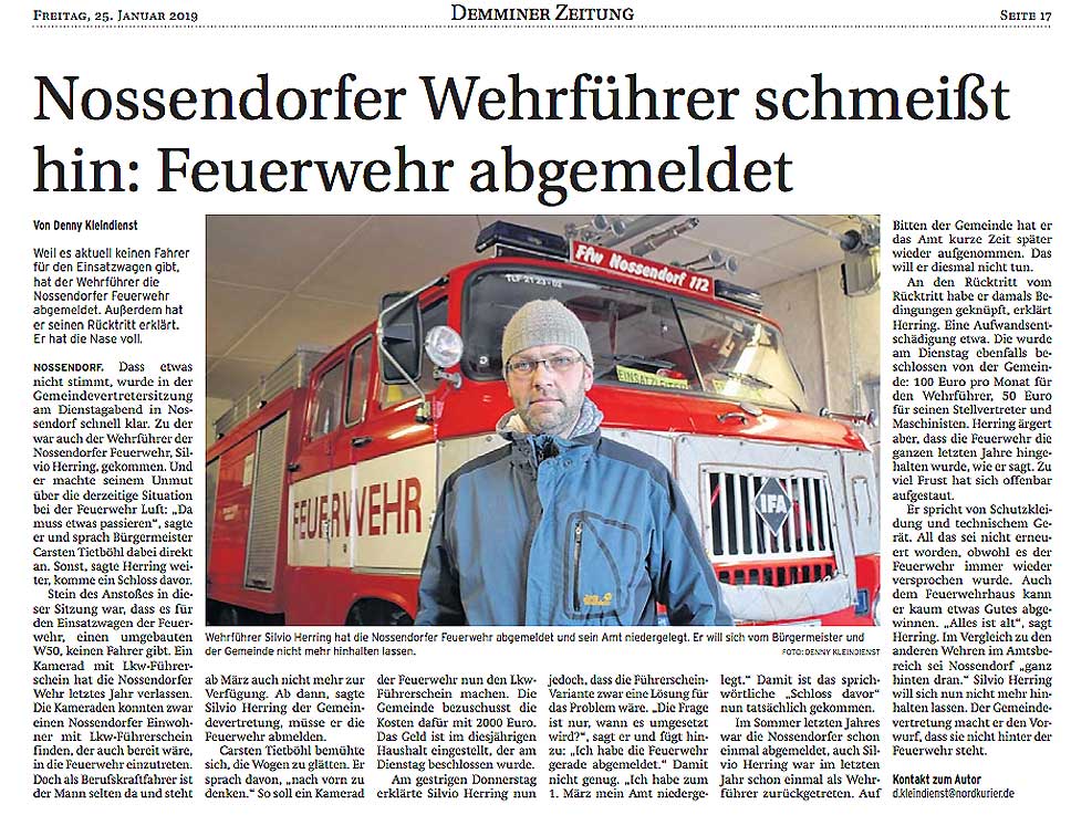 Zuletzt wurde die Feuerwehr gefragt die Tannen bei den Neubauten(Platte) zu fällen. Was sie verweigerten. Den Schnee räumt der BGM aus der öffentlichen Kasse mit seinen Leuten. Warum stellt er nicht den Wagenfahrer sofort ab, dass jeine öffentliche Not ensteht, einen seiner Leute. Fragen des Zeitung-lesenden Nossendorf-Freunds in der Ferne. Wer betrieb die Fällung der Pappel-Allee für wieviel ?Wer zahlte die Spesen.