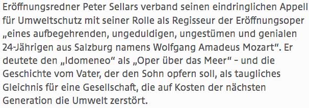 Um Mozart und Sellars zusammen zubringen. Im Sinne seiner Vision des Weltuntergangs. Und im Salzburg von heute, wo das versucht wird. Auf gleichrangigem Niveau oder Dienst an der Sache der Erkenntnisse.