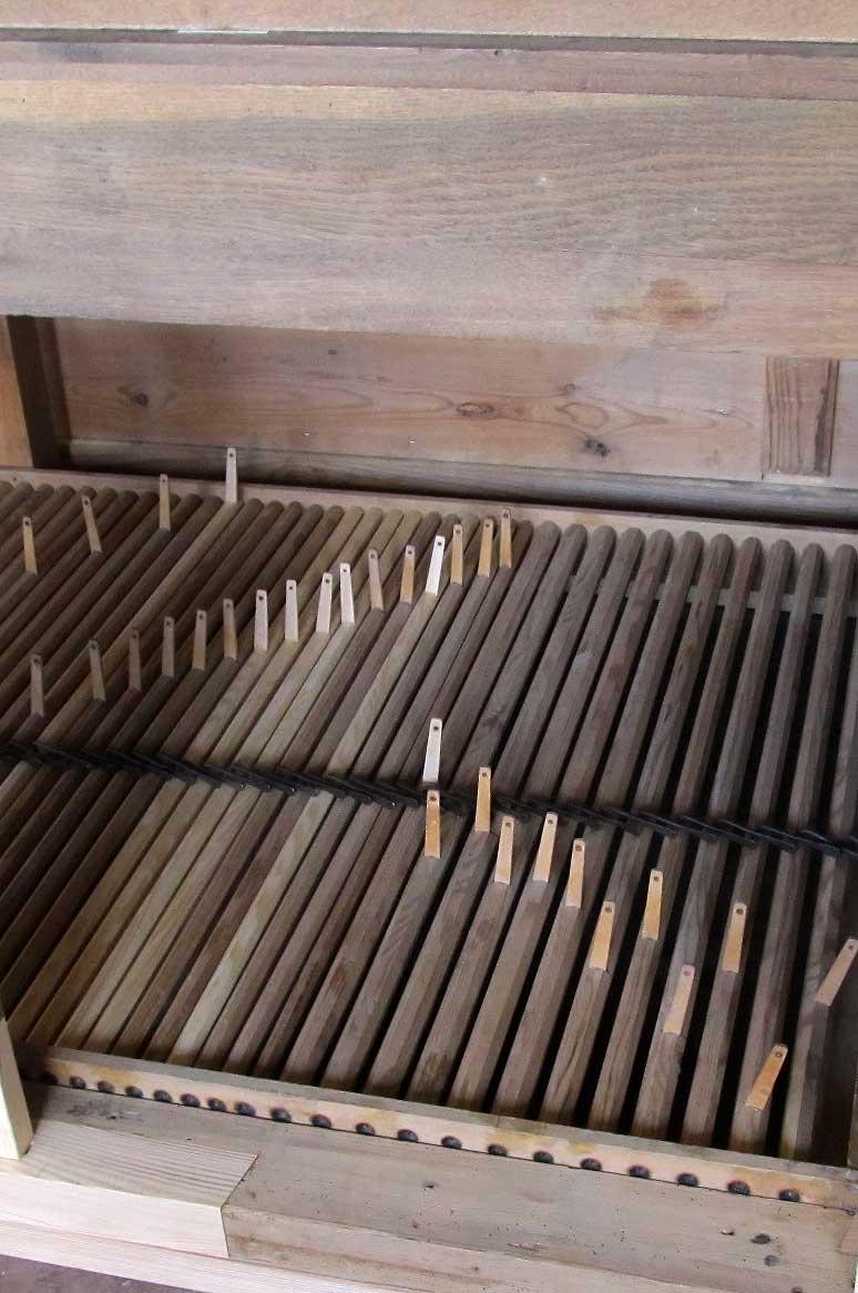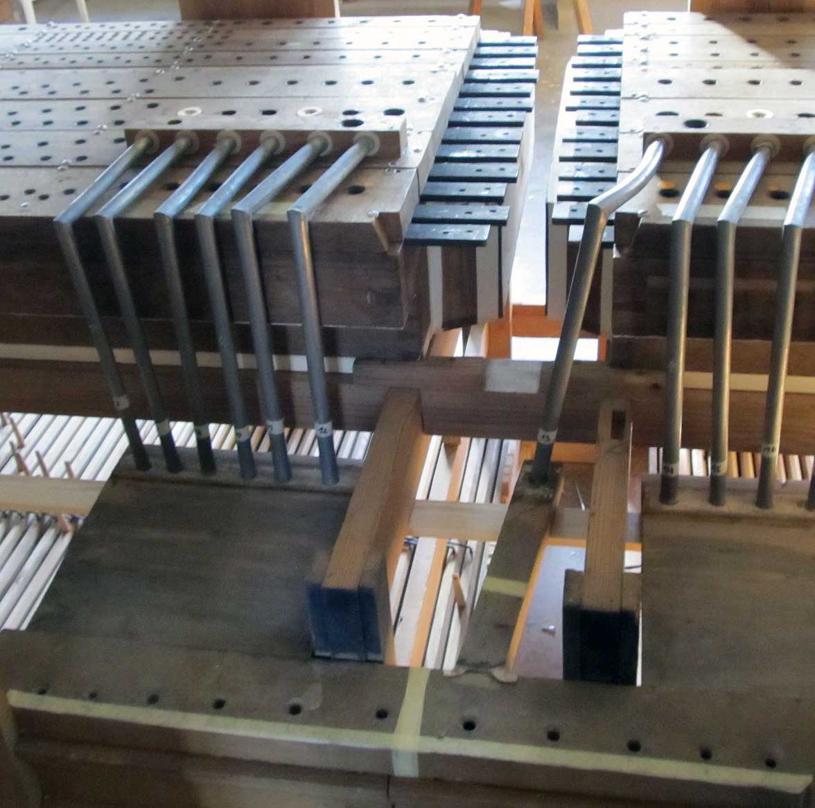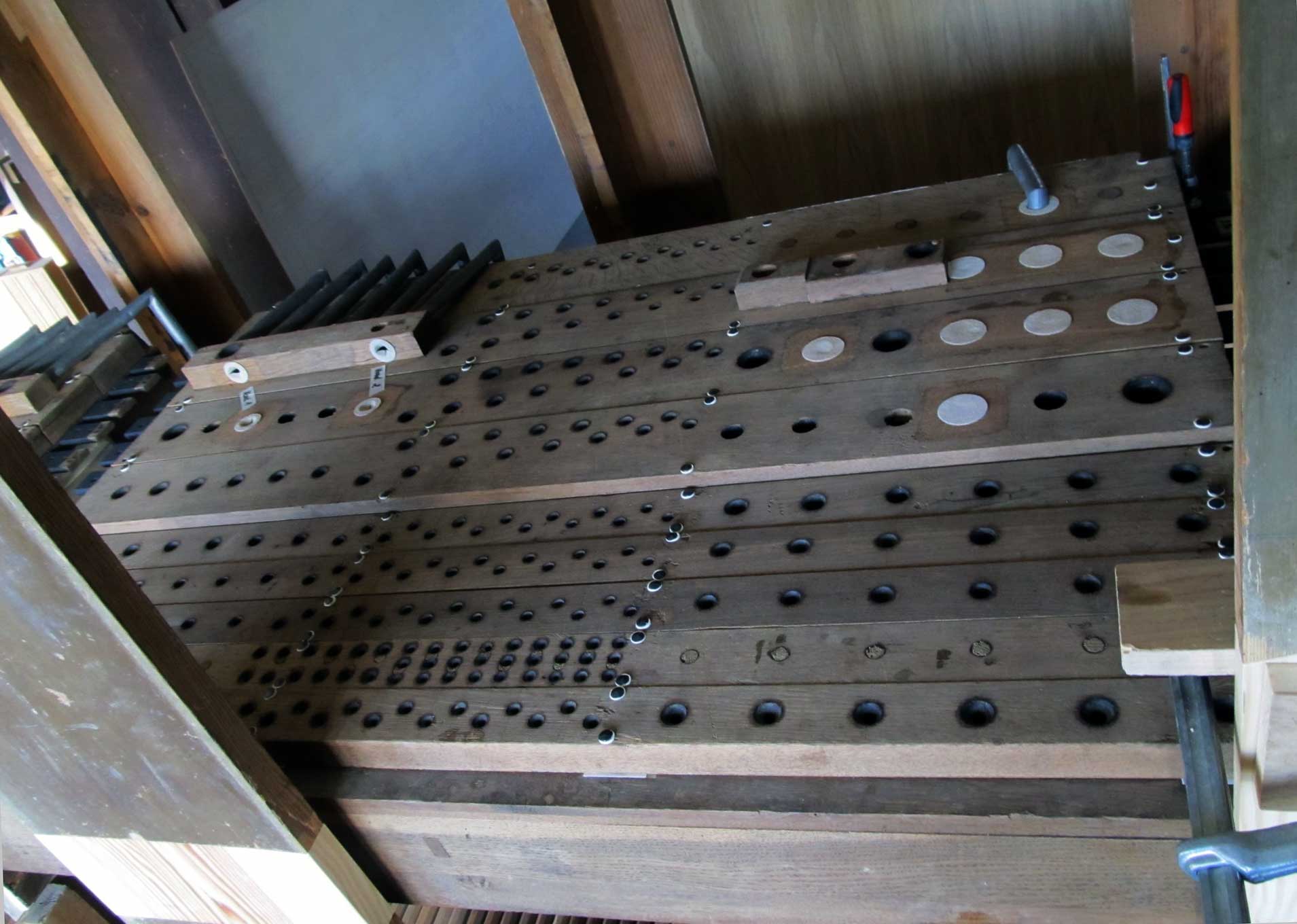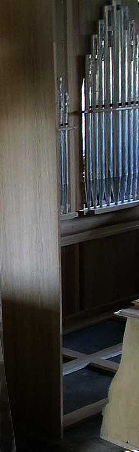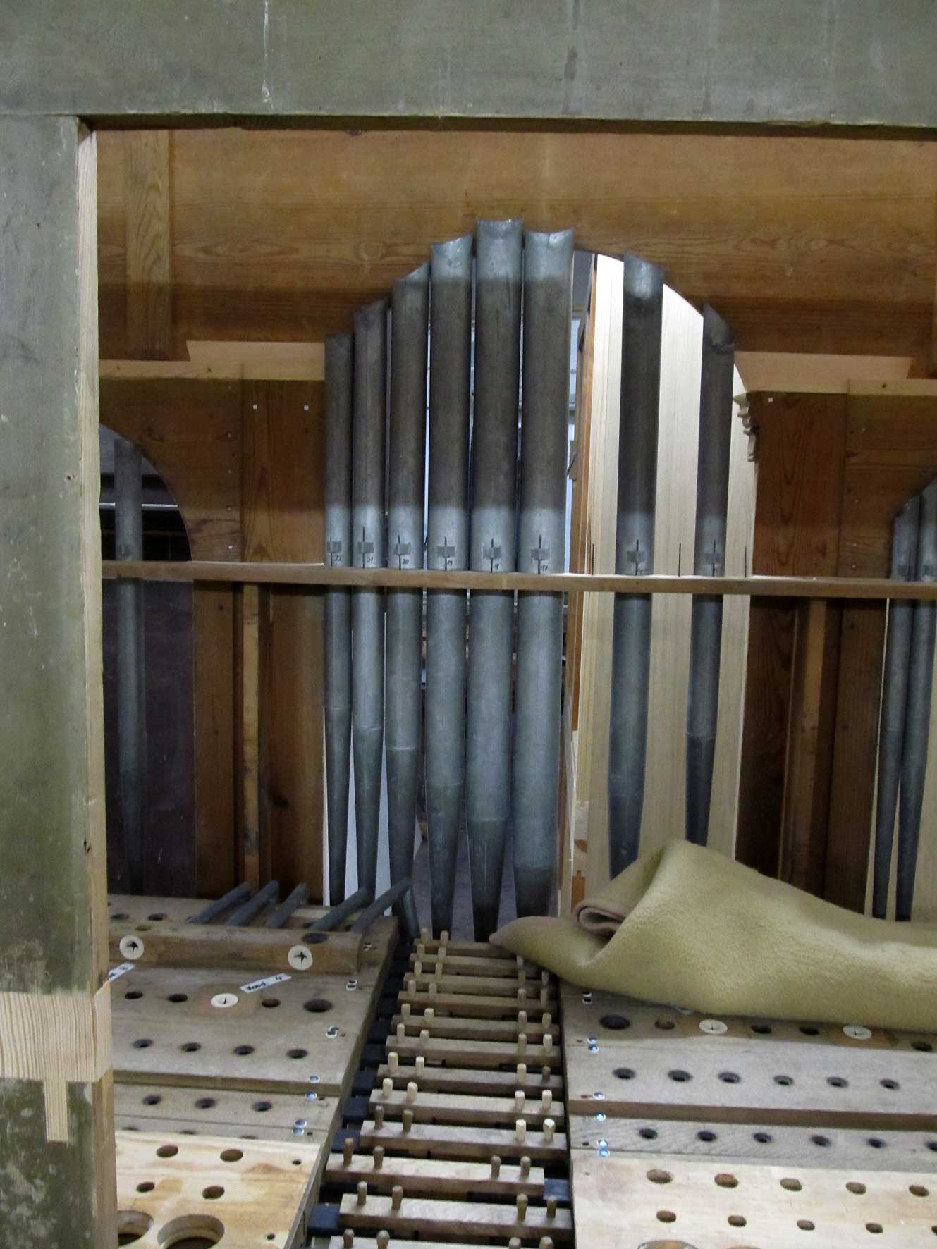 Wir sind mit fast allen Arbeiten fertig. Jetzt fehlt noch das Einpassen der Metallpfeifen. In etwa 14 Tagen könnten wir die Orgel im Betrieb abbauen und nach Nossendorf bringen. Nun kommt es darauf an, wie schnell die neue Bälgekammer vorbereitet ist und ob alle anderen vorbereitenden Maßnahmen soweit abgeschlossen sind.