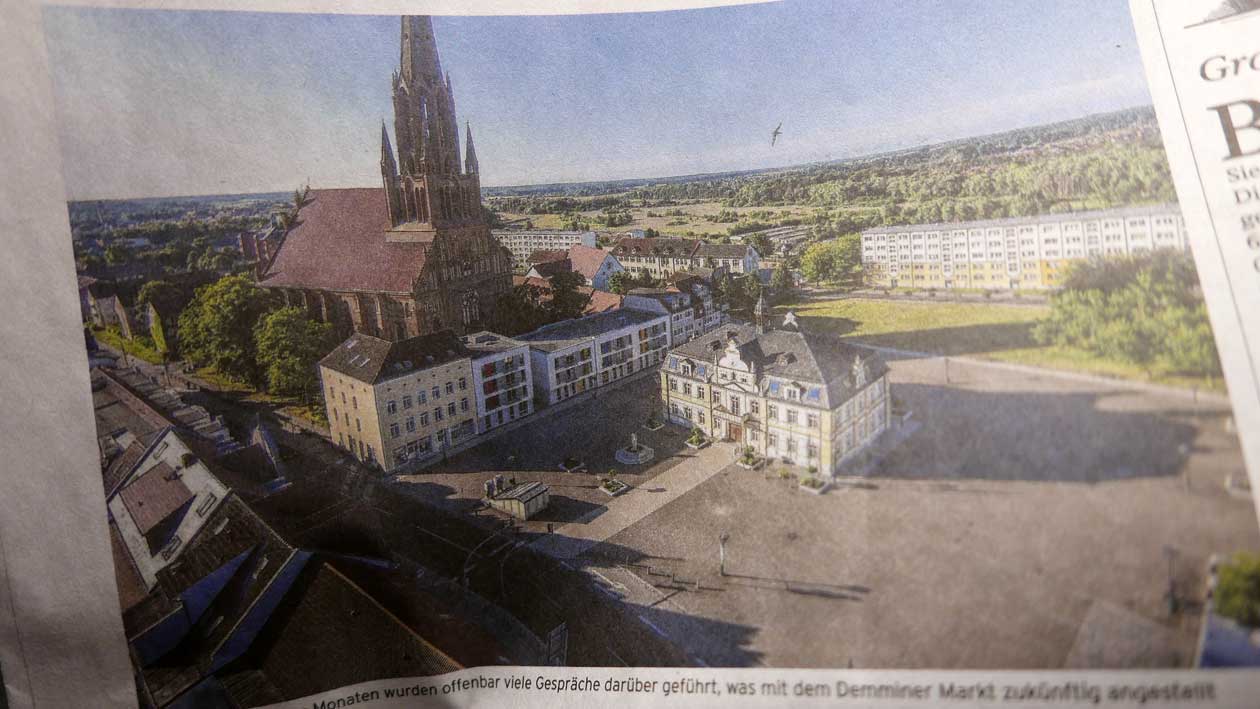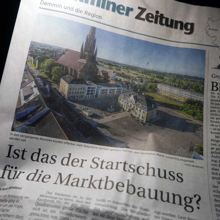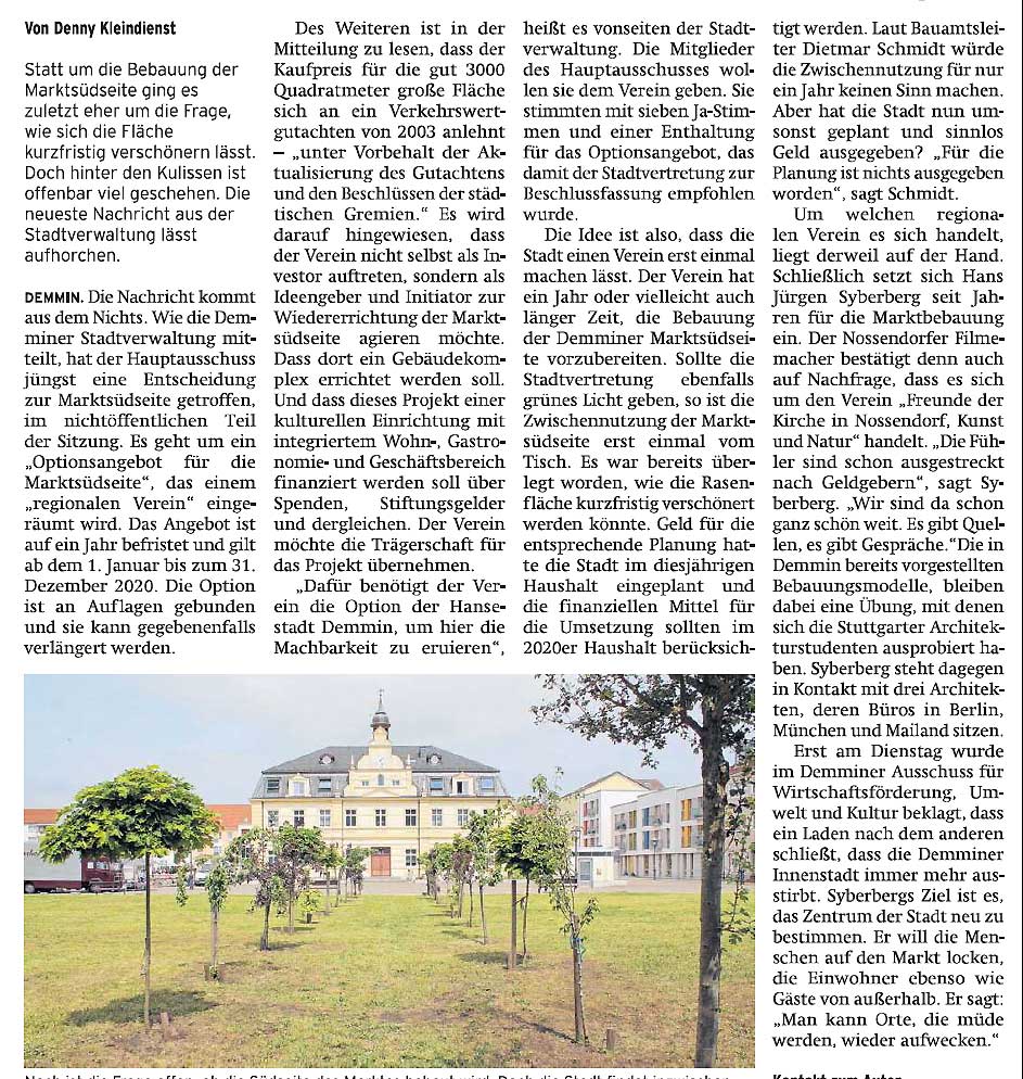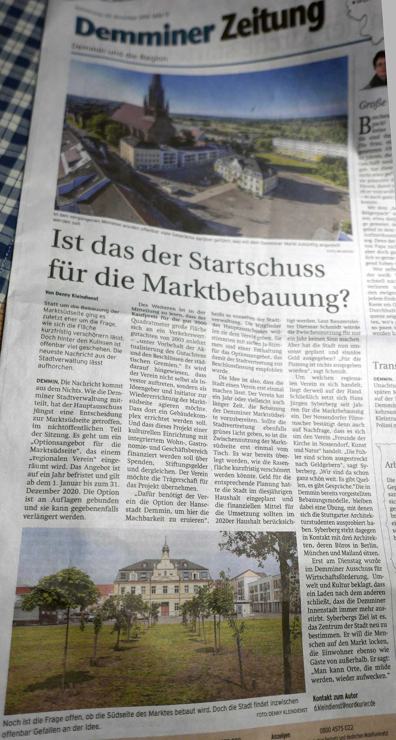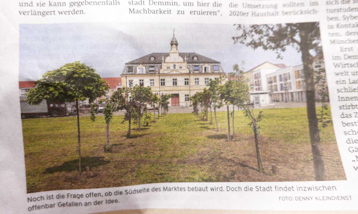 Wenn wir diesen Markt von oben sehen, sehen wir was an ihn fehlt. Im Rücken des Blicks das Cafe Zilm. Gegenüber vor dem grünen Rasen die Seite der Geschäfte, Cafes und Wohnungen darüber. Links die Wand an der offenen Seite entlang der schnellen Durchgangs-Strasse.