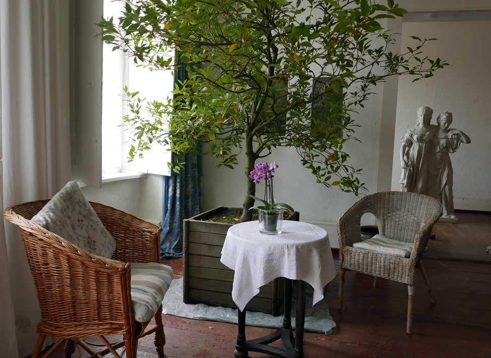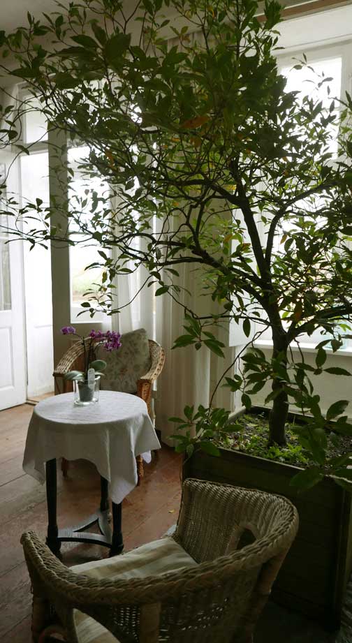 Zuhaus in N. sind nun die Lorbeerbäume wieder im winterlichen Haus. Das Gehäuse als Modell.