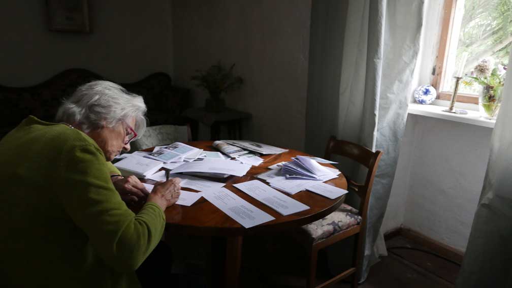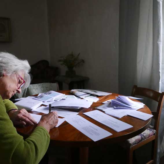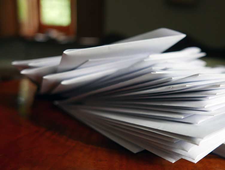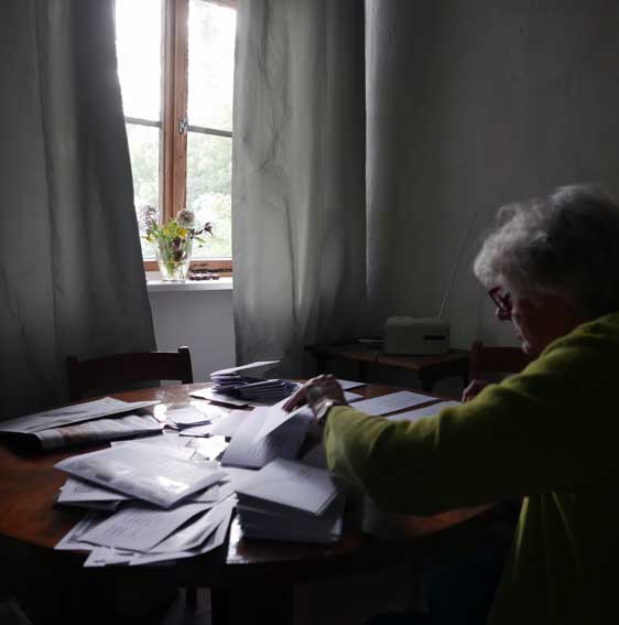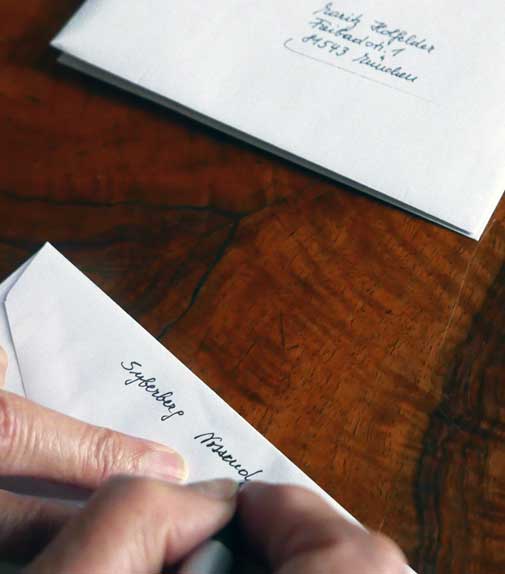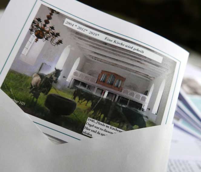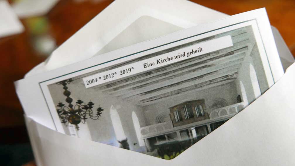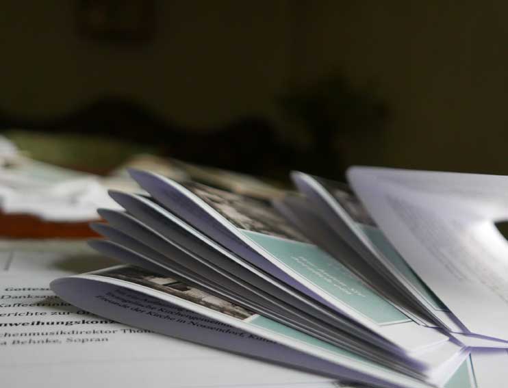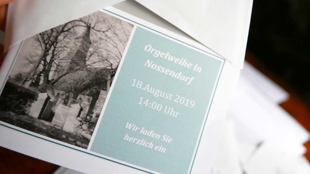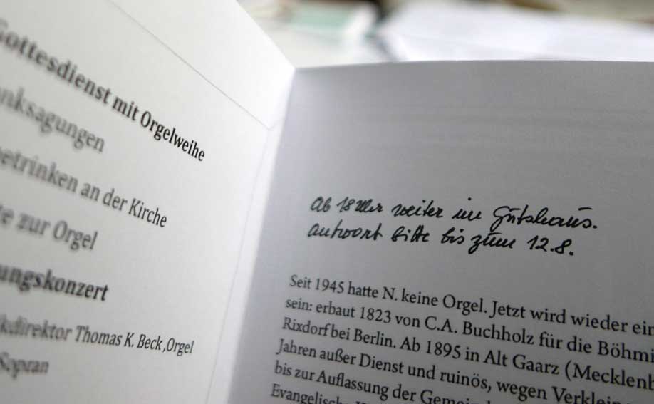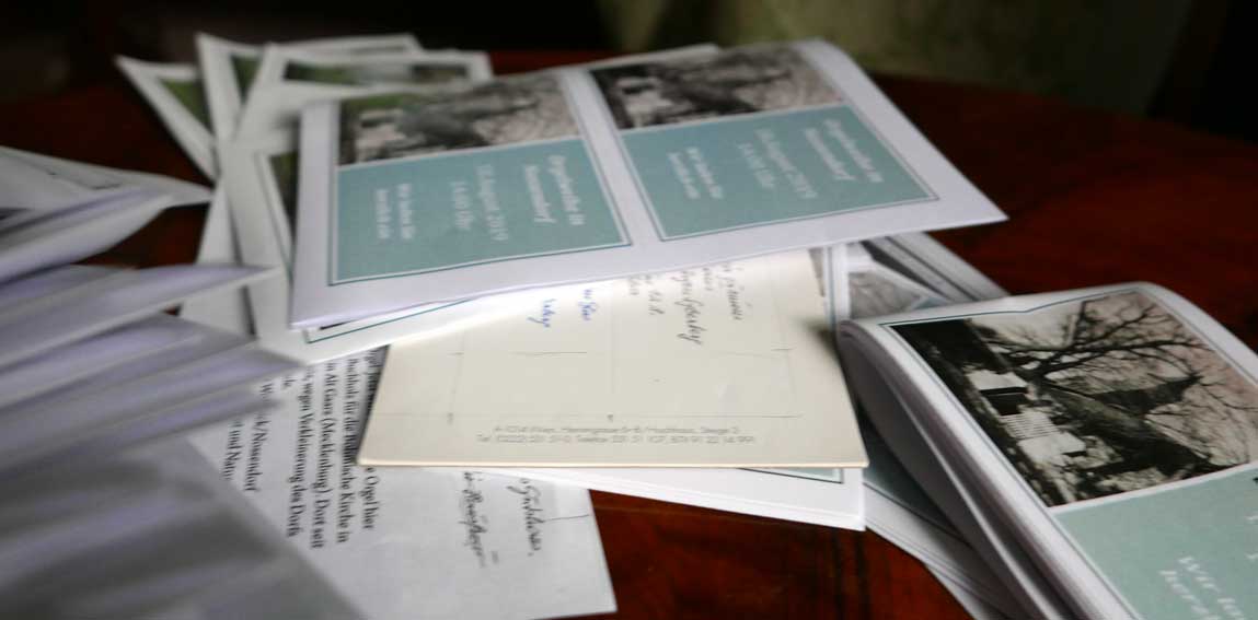 Die ausgedruckten Einladungen für die Einweihung der Orgel müssen auf den Weg gebracht werden