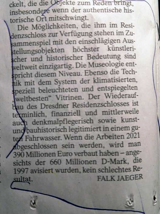 Aus Ruinen, ja, wieder auferstanden, trotz der Umzüge auf leerem Grund, und falschen Palästen aus banalem Material ohne Gestein, an solcher Stelle, zu einem Nichts zerronnen. Um Raubkunst der Welt nun ein Denkmal. Wie zu füllen besser als mit Tönen, die uns blieben.