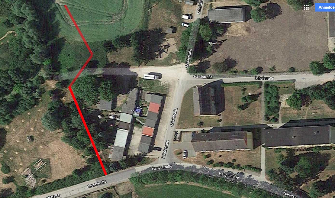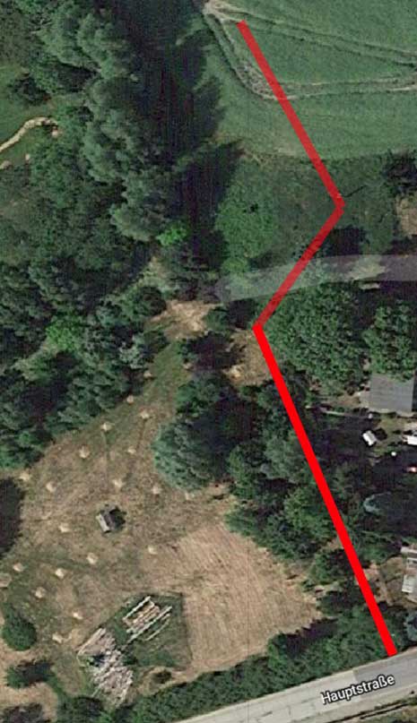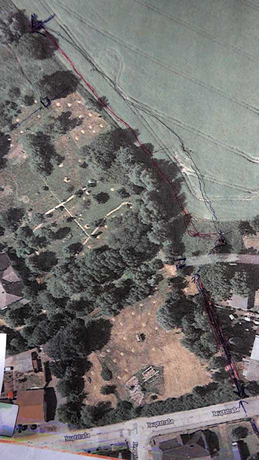 der Versuch mit roten Stift einen wieder zu öffnenden Graben nben dem dunklen auf dem Feld(Rohrverlauf) zu markieren.