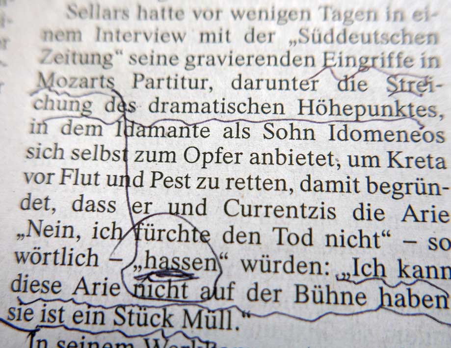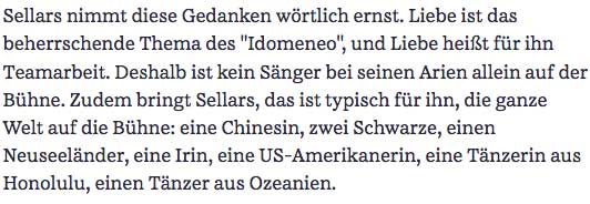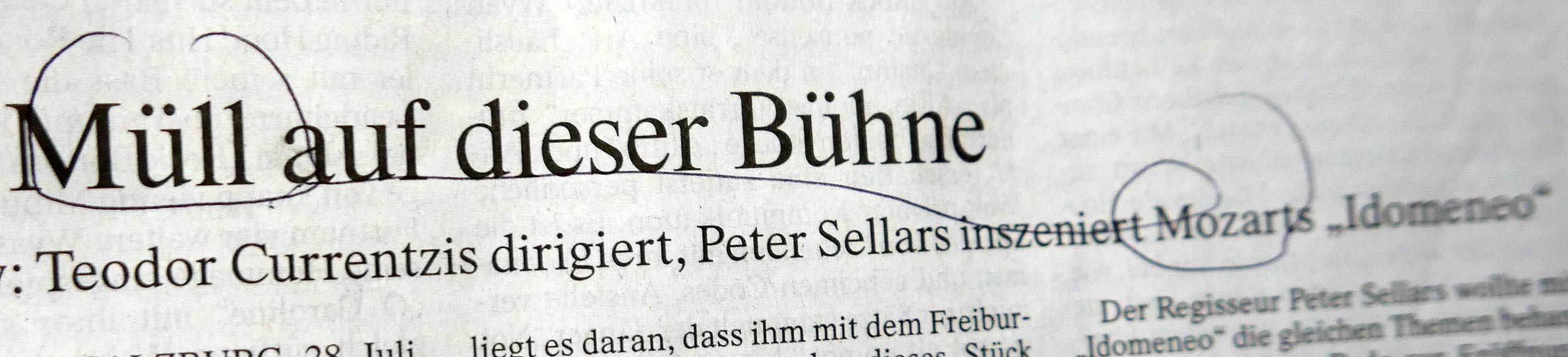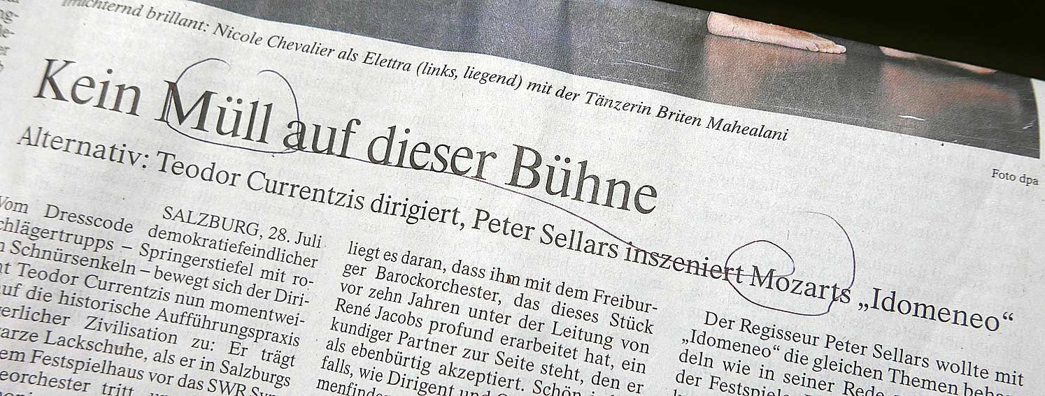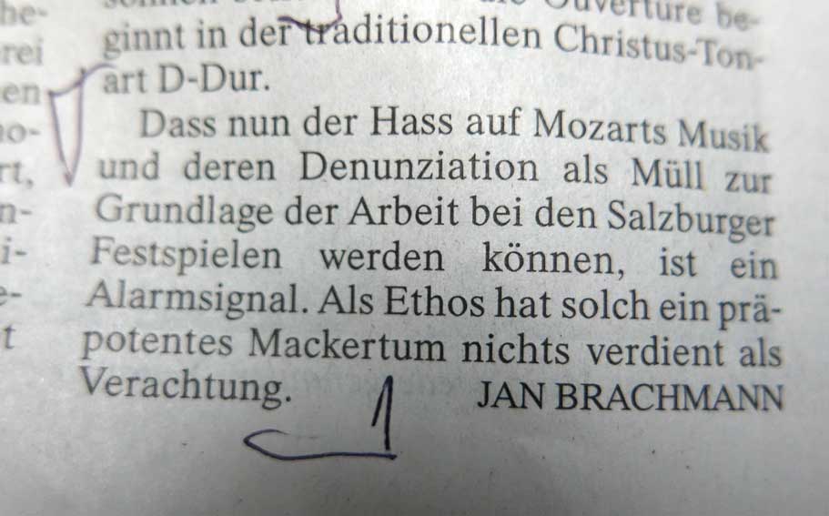 Was ist mit diesem Urteil der FAZ in Salzburg anlässlich der aktuellen Darstellung der kulturellen Welt geschehen. Es übersteigt den Bereich der aesthetischen Dimension und verlangt eine ethische Warnung. Und das steht nicht allein und sollte auch eine Revision der früheren Aufführung des gelobten Titus als Irrtum und jüngste Ungeheuerlichkeiten in Bayreuth(ein Tannhäuser gegen Wagner in seinem Hause selbst) einbeziehen. Dass hier wie dort vornehmlich Geld-und Machtmenschen oder die heimatlose Intelligezia der Städte jubeln, zeigt ihr Bedüfnis nach Deutung aus der gerade noch herrschenden Hippi-Nostagie im Mickimaus Design hier und einer Tucker-Romantik dort allgemeiner Umarmung ohne die Strenge unseres Geschicks in einer Form. Die immer neu zu finden ist. Wer aber in der Musik Mozart streicht gehört vor das höchste Gericht dessen, was diese armen Bewohner des Planten noch haben.