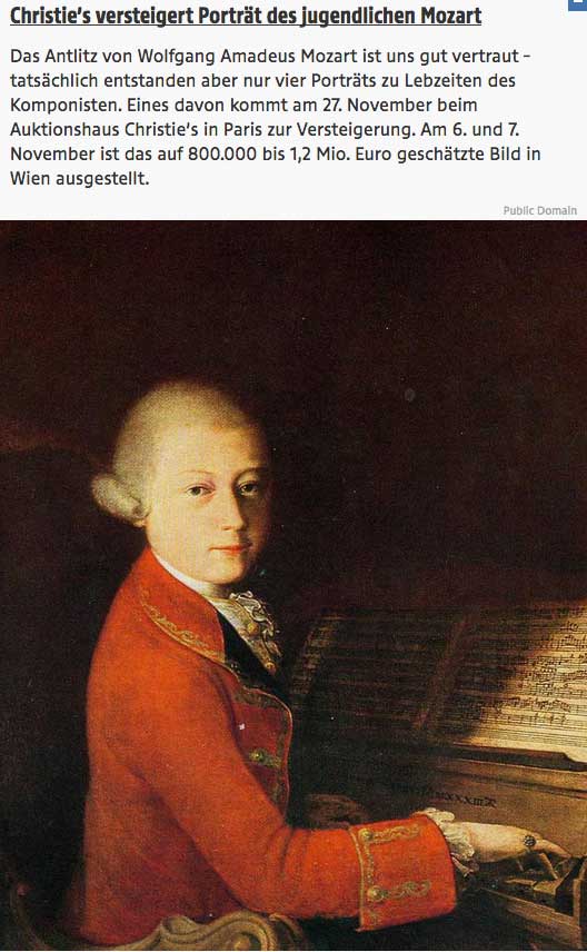 In der Kartusche unter dem Bild wird beschrieben, welch starken Eindruck das musikalische Wunderkind bei seinen Gastgebern hinterließ: „Amadeus Wolfgang Mozart aus Salzburg / Ein Kind, zwölf Jahre alt / Hat jedes Lob und Stellung der Musikalischen Künste übertroffen / Ein Name der den Königen von Frankreich und England sehr lieb ist / Pietro Lugiati, sein großzügiger Gastgeber, beauftragte das Porträt / In dem Musikzimmer seines Hauses, im Jahre 1770.“ Eine weitere Inschrift beschreibt die Herkunft des abgebildeten Cembalos.