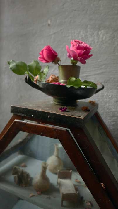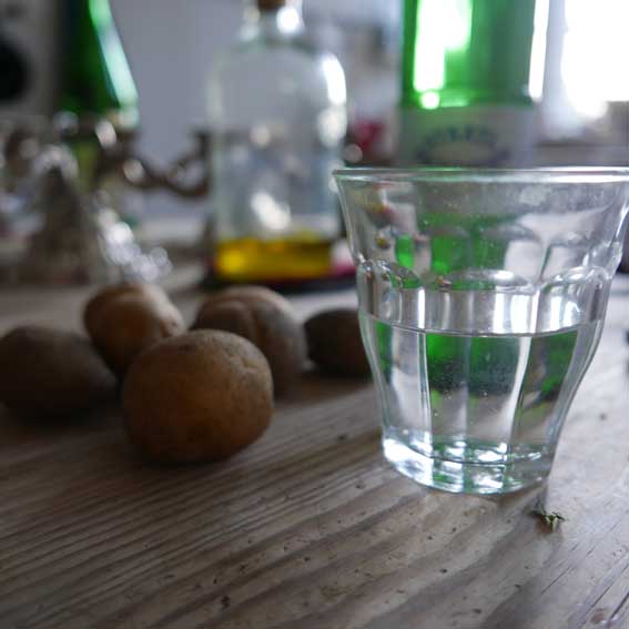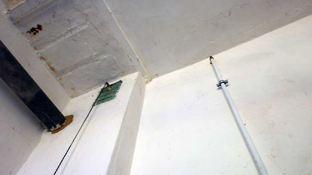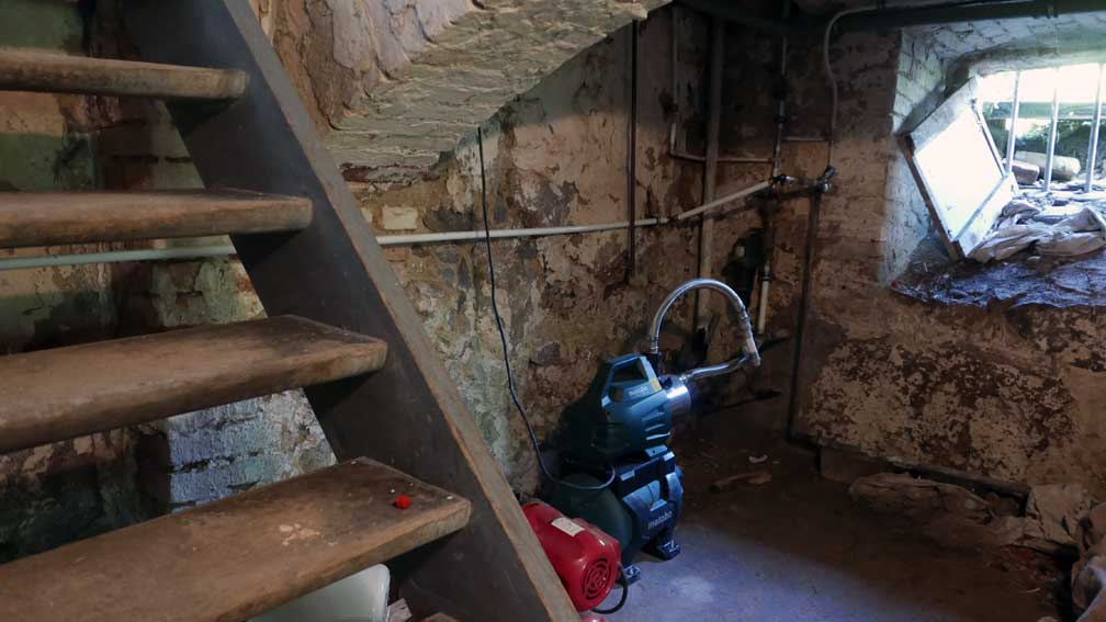 Am Ende läuft es wieder, läuft, und es ist Wasser quer durchs Haus von unten hinauf, 30 Meter, aus dem Keller in den oberen Stock, über Betten und Ankleidezimmer früher so genannt, jetzt des Morgenfensters Tisch. Auf der anderen Seite des Turms. Die Kargheit der Räume durchschneidendofr ohne Strom, die Verkablung ober Putz zu meiden. Aber läuft.
