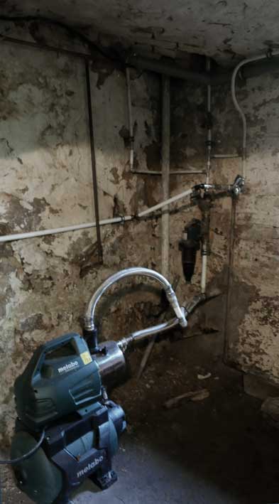 das Wasser aus dem Brunnen mit der Pumpe hochgesaugt und weiterzuleiten also auf neuem Wege ober über den Wänden nun