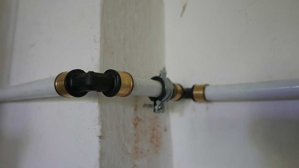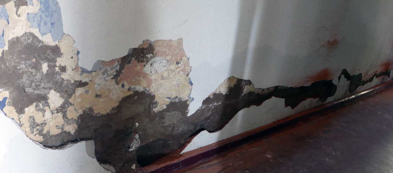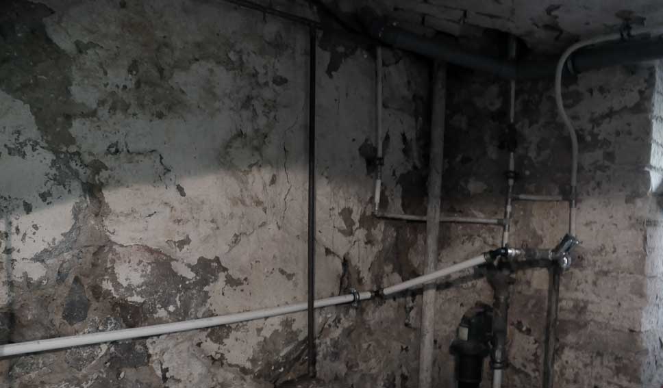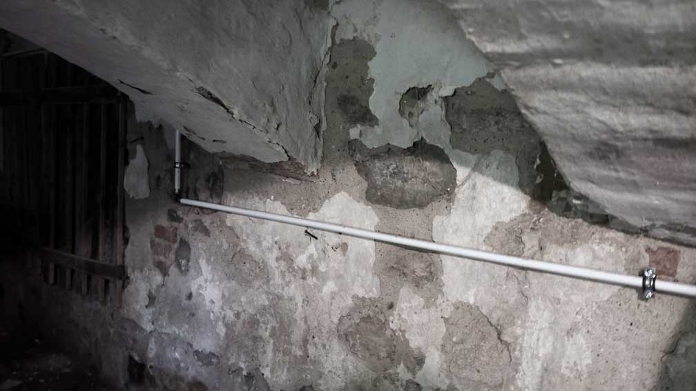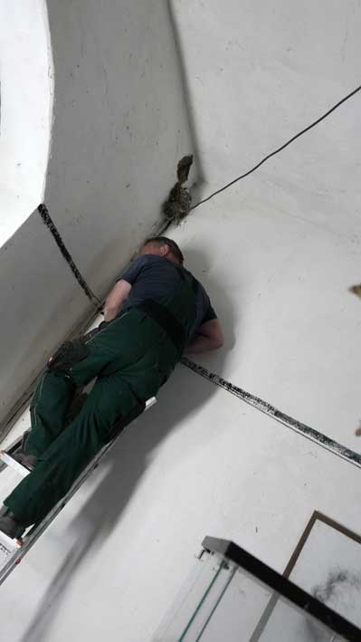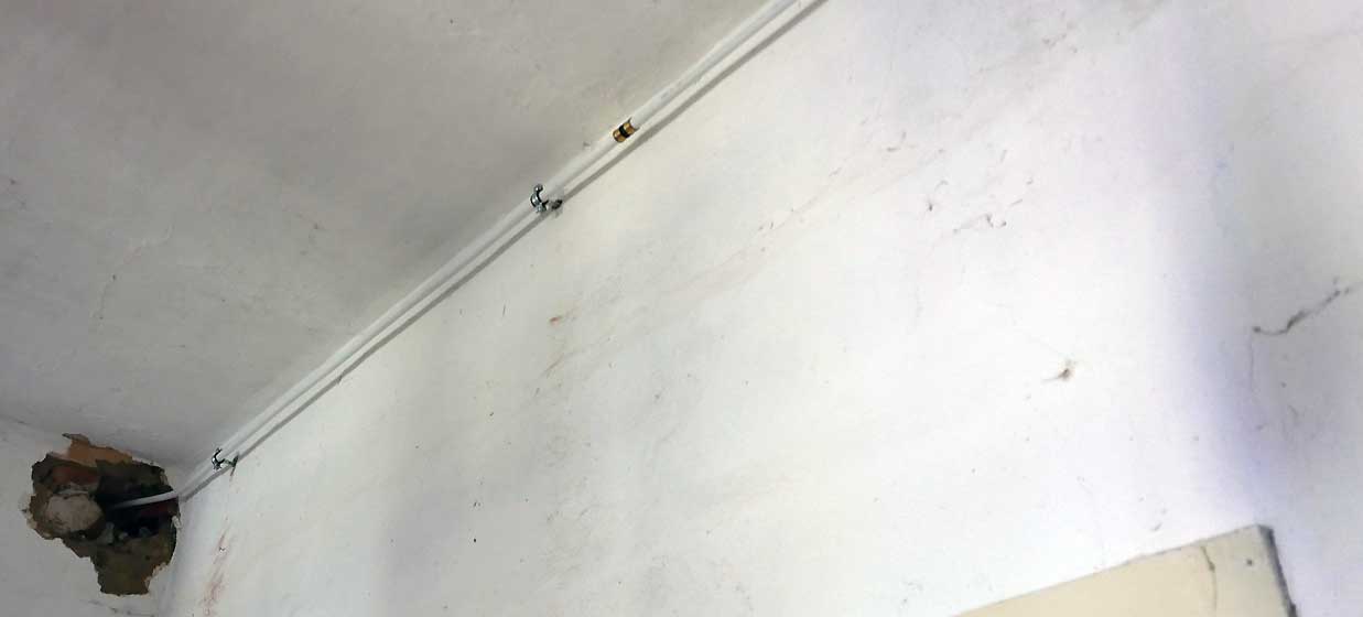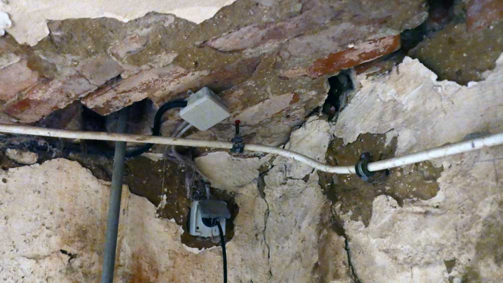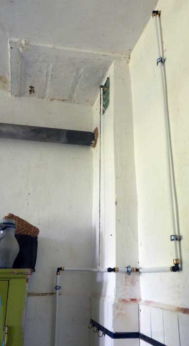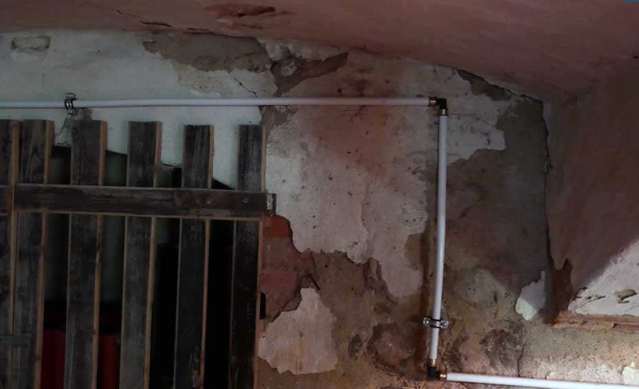 was hier oben nun verläuft, lief vorher, früher seit 90 Jahren unten, in der Wand und die ist nun nass im Lehm zum trocknen teilweise offen und still gelegt