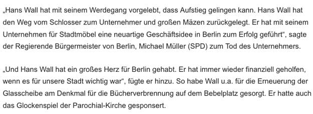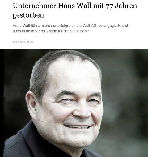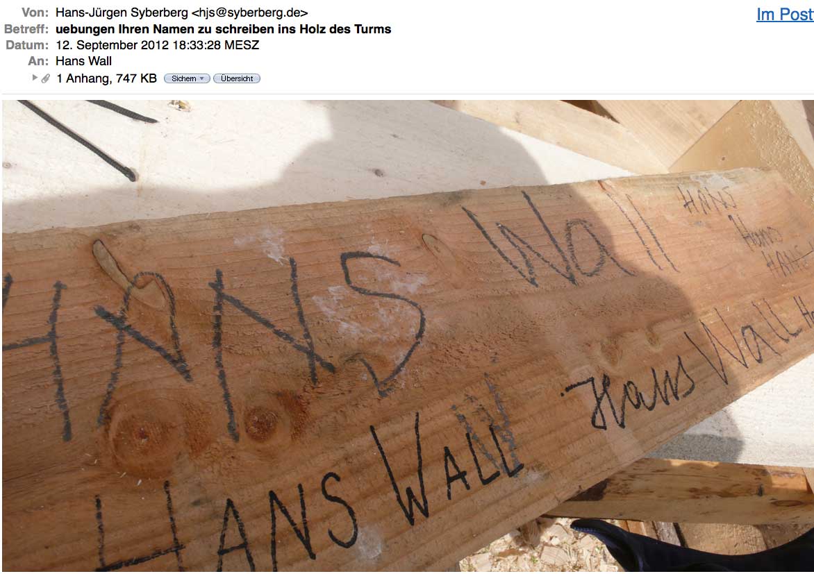 Unsere Geschichte begann mit einer Mail nach der Lekture eines Zeitungsberichts zum Turm wieder in Nossendorf für den wir das Geld nicht hatten. In der Art, dass er fagte, ob ich erlaube, wenn er die fehlende Summe von damals geschätzten 40 000 Euro überwiese. Dies, nachdem er gelesen habe, was da in N. entstanden ist und wofür. Das erhöhte er dann nochmal später auf 60 000 als es nötig war. Das war H. Wall. Als erfolgreicher und produktiver Unternehmer erkannte er was hier geschehen war.