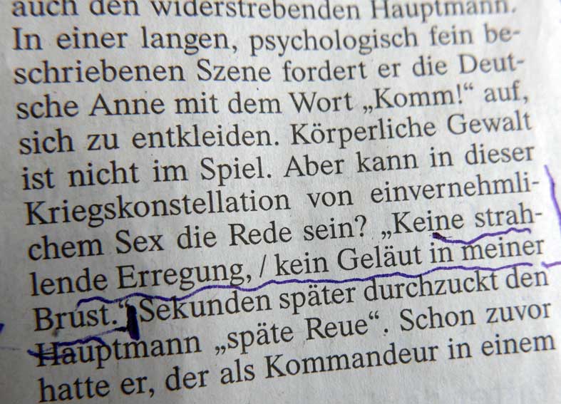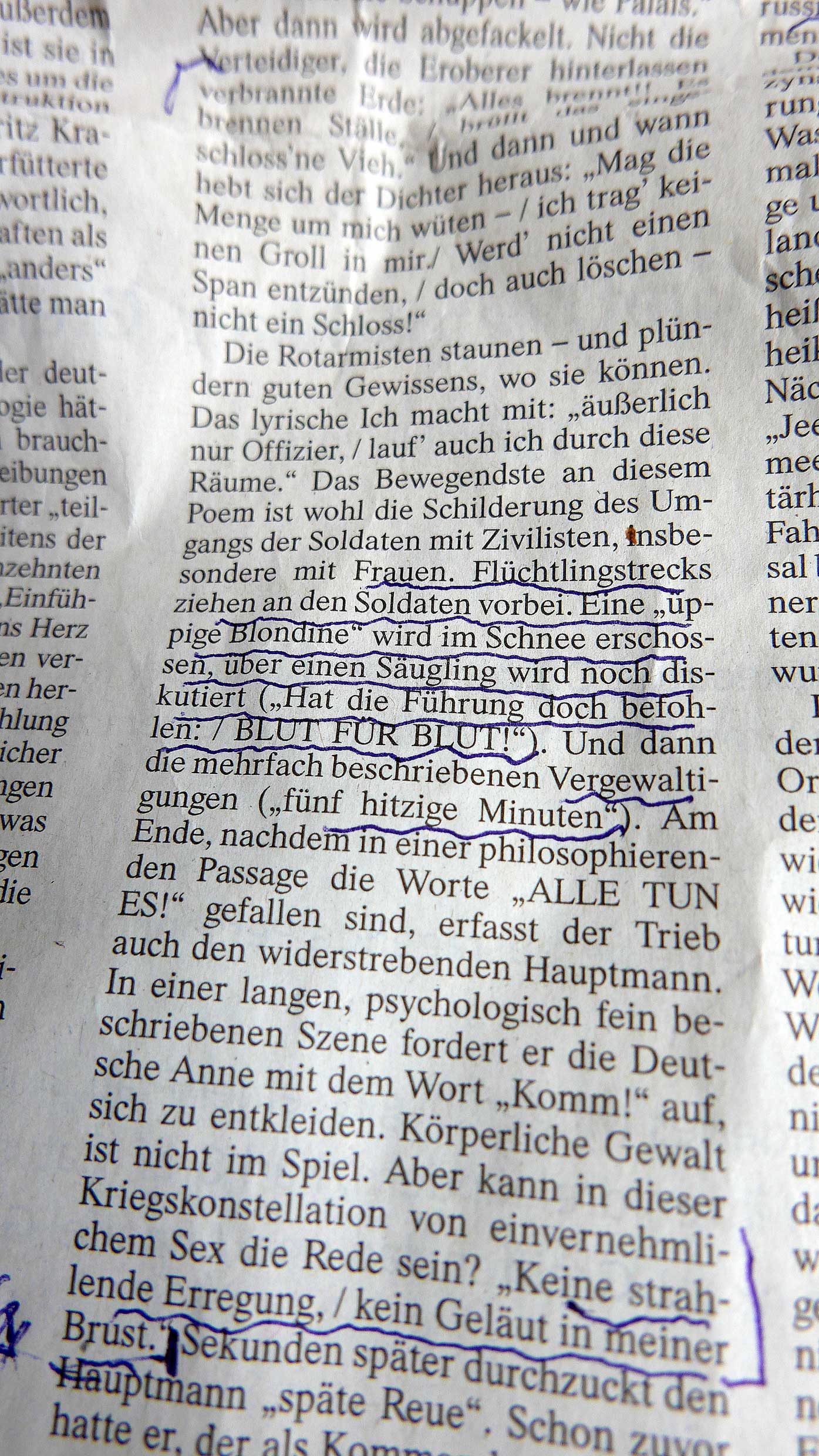 Immer wieder in Demmin Vorpommern die Fragen warum es zu den vielen Selbst-Tötungen kam. Warum der Band. Die meisten Antworten sind weil die Propaganda Panik bewirkte, weil selbst schuld, Krieg begonnen und alles Nazis, auch alles selbst angezündet. Die Strafe. Dann begann das grosse Schweigen in der DDR. Mit Abrissen, was noch stand. Die zweite Selbsttötung der Stadt. Kein Recht mehr. Jetzt darf man reden. Die Leere in der Mitte der Stadt blieb, sie zu enden wäre das Ziel.