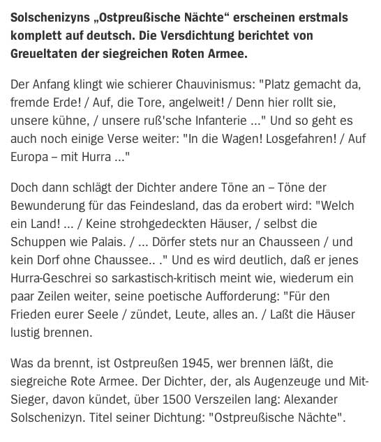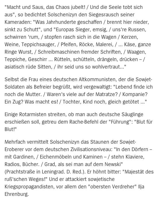 Was damals geschah ist aus den aufrichtigsten Quellen auch der anderen Seite nun selbst bekannt. In eine Form gebracht. Die Panik war keine krankhafte Reaktion. Viele Opfer kamen auch aus Ostpreussen. Und wussten was geschehen würde.Rachegefühle auch heute keine Antwort. Krieg darf nicht sein. Und wir dürfen unsere Städt und Häuser wieder aufbauen.