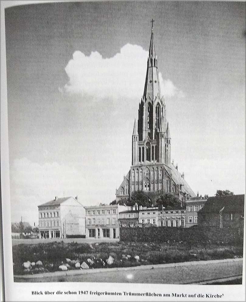 Es zeigt den Markt in Demmin mit den Häusern an der östlichen Seite. Und es zeigt sich von 1947 in gutem Zustand. Mit Fenstern und Läden ohne erkennbare Brandschäden. Das heisst wie die Kirche blieben auch die sie umgebenden Häuser frei vom Feuer. Und man darf davon ausgehen. dass das, wie auf hier nicht sichtbaren und unbeschädigte Südseite an der Kirche, so gewollt war. Aber es hat das Feuer ferngehalten. Sicher nicht eventuelle deutsche Stifter des Brandes, die Entsetzen gewollt hätten. Total. Weltuntergang. Das ist die erste Erkenntnis.