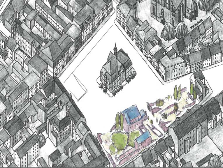 Was für eine Chance das Zentrum einer Stadt neu zu gestalten, vorzuschlagen, In der Form der Gebäude und in ihrer Funktion. Das, was seit 1945 ausbrannte, abgerissen war, in Teilen nur wieder entstand, vorwiegend zentral leer steht. Vor allem die Südseite des Marktes ist wieder zu errichten, dahinter den Raum zu füllen und gegenüber im Nord-Osten (Cafe Zilm) den Gegenpol zu bestiummen, dass der Raum des Marktes sich wieder schliesst. Als Zentrum dessen, was von da aus denkend noch zu tun ist.