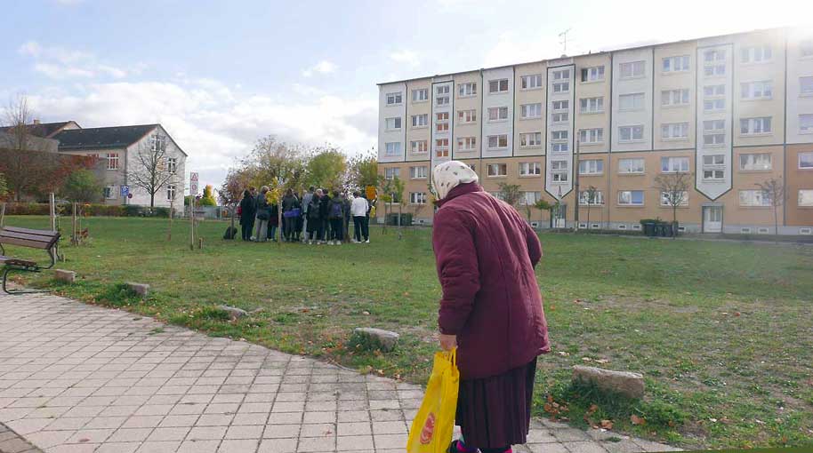 Von dem Turm der Kirche aber, St. Bartholomaei, die das Feuer überstand, wird man das Leichentuch der Toten von 45 in diesem Jahr vielleicht zum ersten Mal herabhängend, signieren können nach und nach selbst mit den Namen, jedes Namen für Namen, deren Listen wir haben. So hätten sie dann in der Stille den Ort, von oben herab und hinauf, gefunden, wo sie hingehören. Wenn von innen die Töne kommen, die dazu gehören. Aus den Stimmen der Bewohner der Stadt und ihrer Umgebung selbst. In jedem Jahr. Zur rechten Zeit.