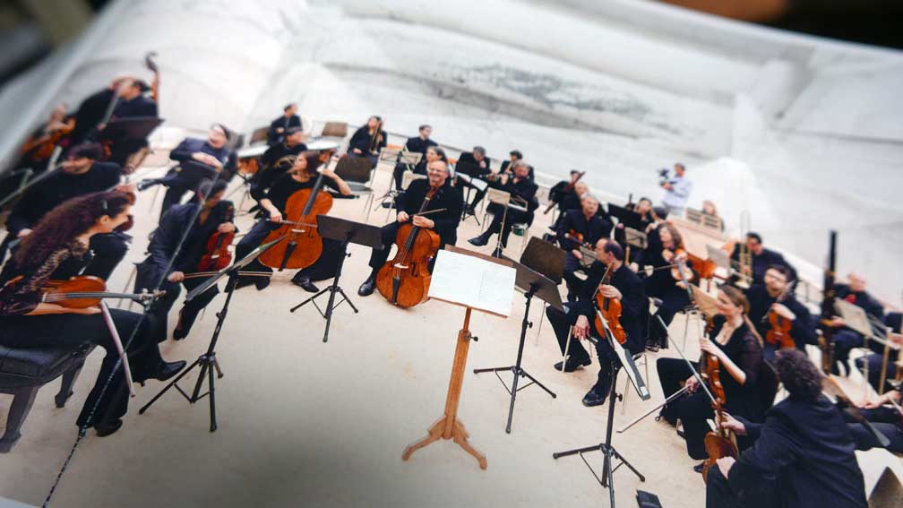 von gewitzter Hand entworfen aus dem Willen eines, der was machen will, Gesang un d Töne hörend von oben woher es alles kommt hinein wie geworfen den Raum dazu
