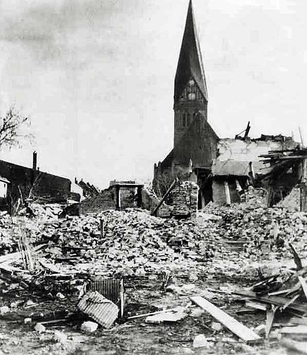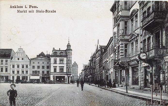 US-amerikanische Bombenangriffe, auch auf die Aradowerke, zerstörten 1943 (besonders am 9. Oktober) und 1944 große Teile der Innenstadt. Am 29. April 1945 besetzte die Rote Armee Anklam. Die Stadtväter verhandelten mit dem sowjetischen Generalmajor Borstschew in der Bluthsluster Straße 3 über die kampflose Übergabe der Stadt. Noch am selben Tag wurde Anklam von der deutschen Luftwaffe bombardiert.[19] Außer Anklam traf dies in Deutschland nur Freiburg im Breisgau und Eberswalde. Insgesamt wurden von 1943 bis 1945 zirka 80 % der Innenstadt durch die Luftangriffe, durch Kampfhandlungen und Brände Ende April 1945 zerstört. Vom historisch vielfältigen Bauensemble mit Giebelhäusern der Backsteingotik und des Barock sowie Fachwerkbauten blieb beinahe nichts erhalten.[20]