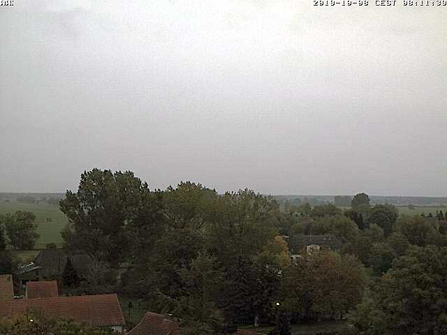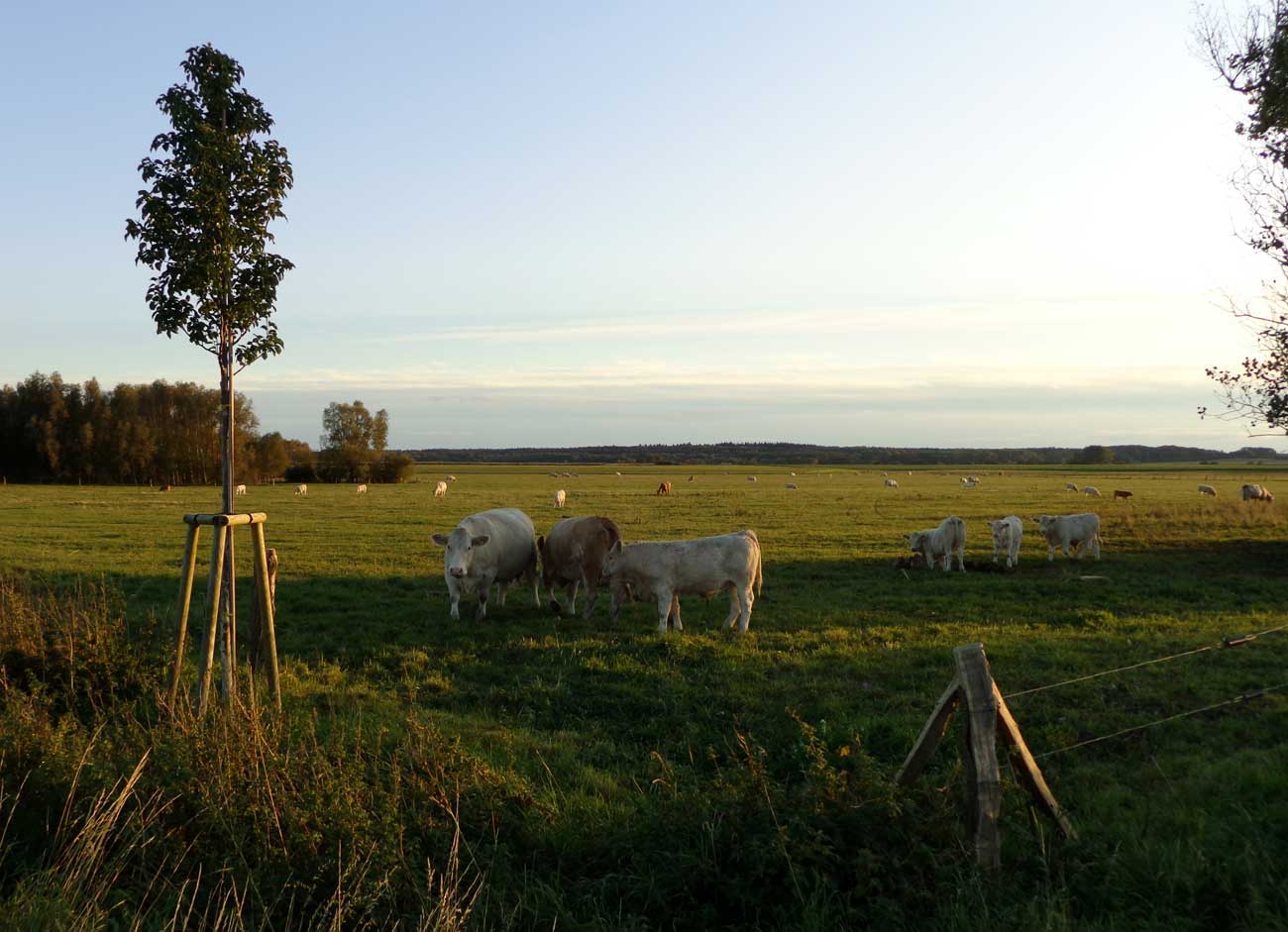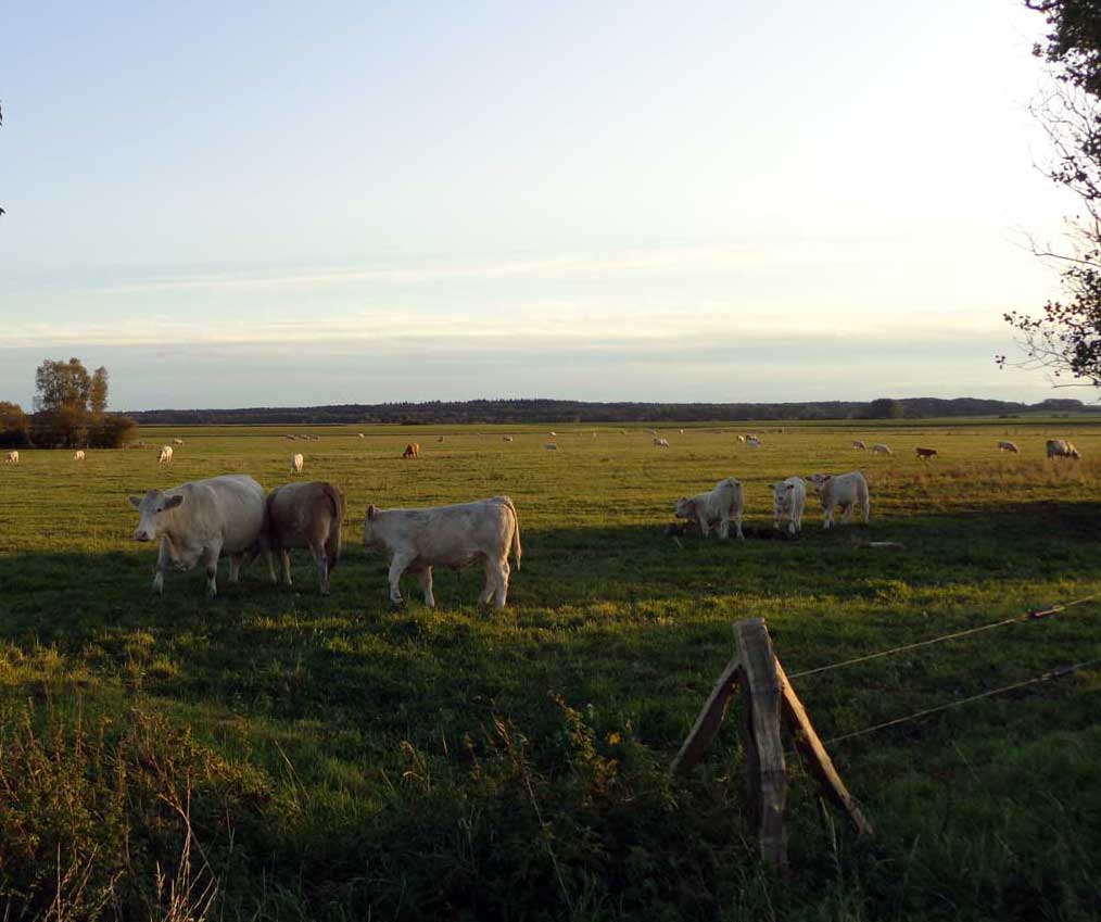 Die Rinder frei auf der Wiese vor dem Dorf, und die Trebel hinten unter dem Wald am Horizont.
