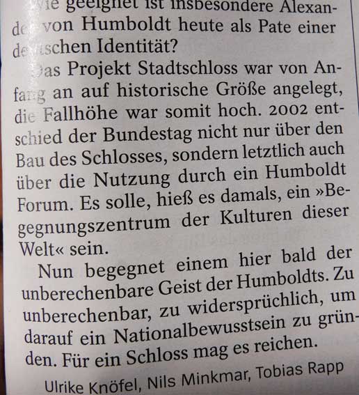 Dass dies Haus in der Mitte Berlins nicht zum intellektuellen Furz werde und schwarzen Menetekel der Europäer, als sie die Welt besetzten, mit Kolonien, braucht es einen neuen Plan für seinen Geist von innen.