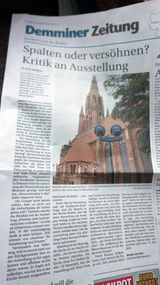 Eine Ausstellung wird angekündigt. In der Demminer Kirche.