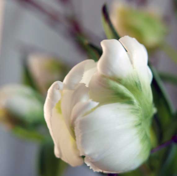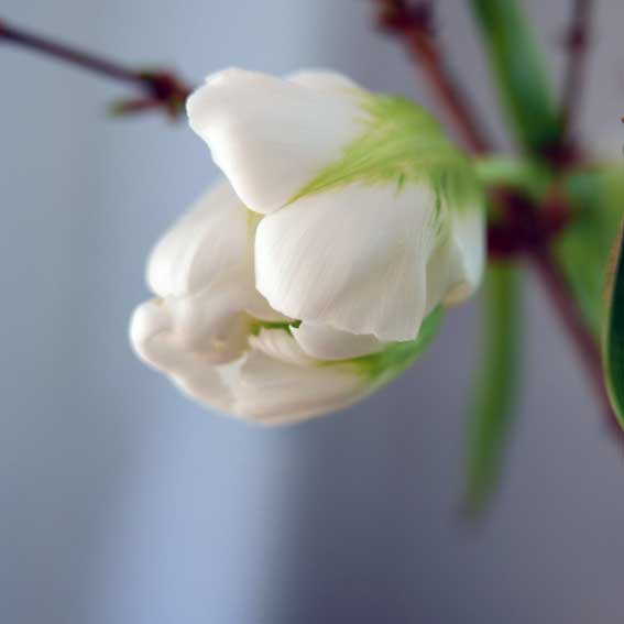 Als die Tulpen schwer wurden in der Vase, bekamen sie Stützen durch dünne kahle Sträucher.