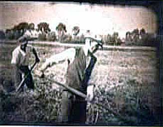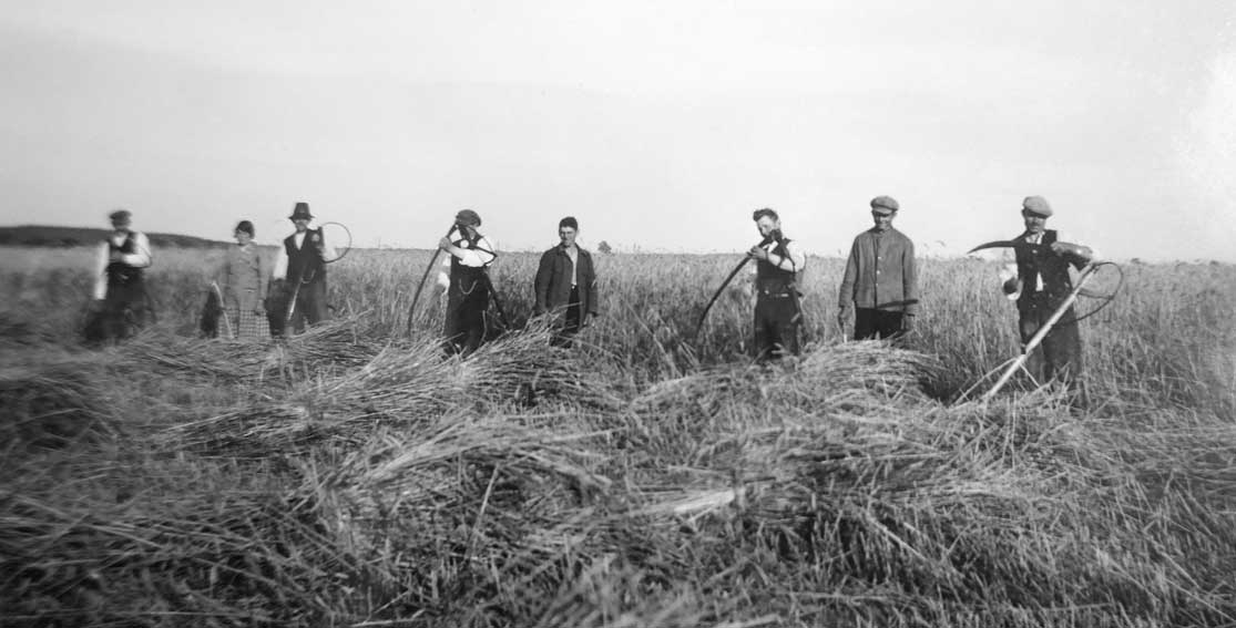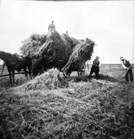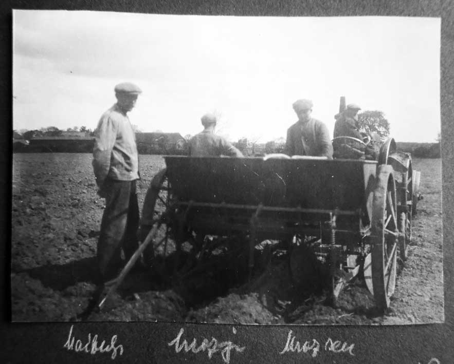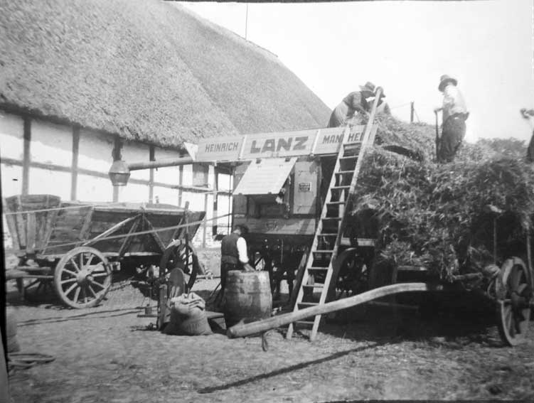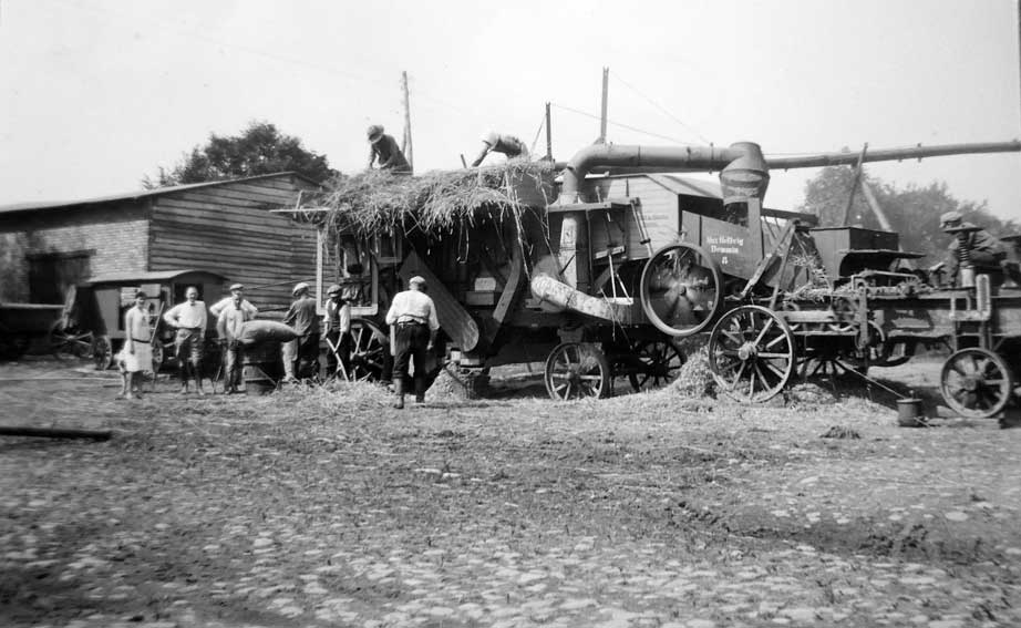 Dreschen auf dem Hof Scheune, wo heute die Halle steht. Sie mussten 45 alle zurück nach Polen. So wie die Deutschen nach Westen. Viel Weinen.